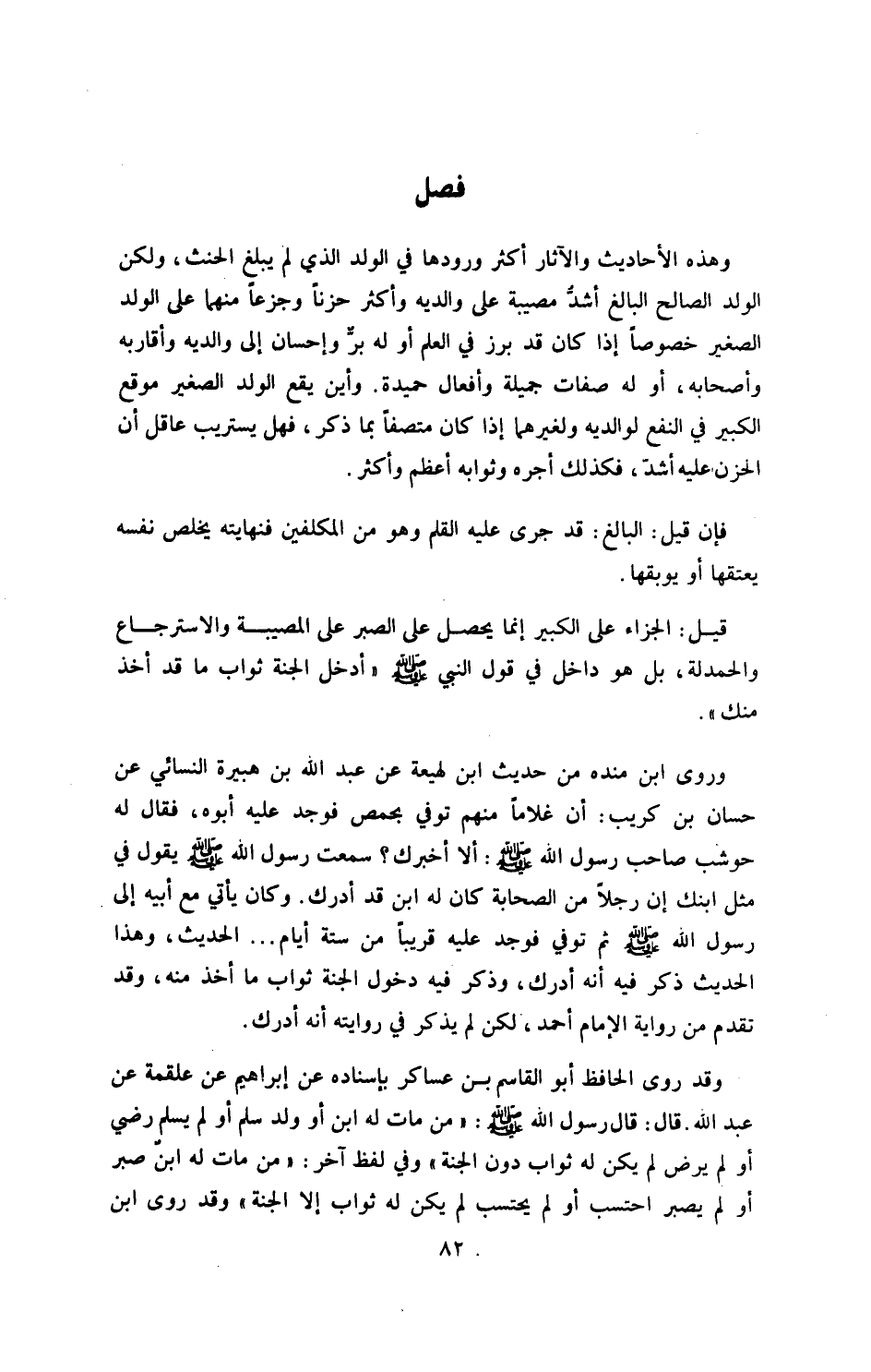 وقد روى الحافظ أبو القاسم بن عساكر بإسناده، «عن إبراهيم، عن علقمة، عن عبد الله، قال: قال رسول الله صلى الله عليه وسلم: من مات له ابن أو ولد، سلم أو لم يسلم، رضي أو لم يرض، لم يكن له ثواب دون الجنة، وفي لفظ آخر: من مات له ابن، صبر أو لم يصبر، احتسب أو لم يحتسب، لم يكن له ثواب إلا الجنة» .