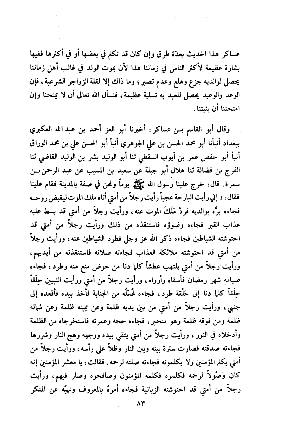 وقال أبو القاسم بن عساكر: «أخبرنا أبو العز أحمد بن عبد الله العكبري ببغداد أنبأنا أبو محمد الحسن بن علي الجوهري، أنبأنا أبو الحسن علي بن محمد الوراق، أنبأ أبو حفص عمربن أيوب السقطي، ثنا أبو الوليد بشر ابن الوليد القاضي، ثنا الفرج بن فضالة، ثنا هلال أبو جبلة، عن سعيد بن المسيب، عن عبد الرحمن بن سمرة، قال: خرج علينا رسول الله صلى الله عليه وسلم يوماً، ونحن في صفة بالمدينة، فقام علينا فقال: إني رأيت البارحة عجباً، رأيت رجلاً من أمتي، أتاه ملك الموت لقبض روحه، فجاءه بره بوالديه فرد ملك الموت عنه، ورأيت رجلاً من أمتي قد بسط عليه عذاب القبر، فجاءه وضوءه فاستنقذه من ذلك، ورأيت رجلاًمن أمتي، قد احتوشته الشياطين، فجاء ذكر الله عز وجل، فطرد الشياطين عنه، ورأيت رجلاً من أمتي، قد احتوشته ملائكة العذاب، فجاءته صلاته، فاستنقذته من أيديهم، ورأيت رجلاً من أمتي، يلتهب عطشاً، كلما دنا من حوض منع منه وطرد، فجاءه صيامه شهر رمضان فأسقاه وأرواه، ورأيت رجلاً من أمتي، ورأيت النبيين حلقاً حلقاً، كلما دنا إلى حلقة طرد، فجاءه غسله من الجنابة، فأخذ بيده فأقعده إلى جنبي، ورأيت رجلاً من أمتي، من بين يديه ظلمة، وعن يمينه ظلمة، وعن شماله ظلمة، ومن فوقه ظلمة، وهو متحير، فجاءه حجته وعمرته، فاستخرجاه من الظلمة وأدخلاه في النور، ورأيت رجلاً من أمتي، يتقي بيده وهج النار وشررها، فجاءته صدقته، فصارت سترة بينه وبين النار، وظلاً على رأسه، ورأيت رجلاً من أمتي، يكلم المؤمنين ولا يكلمونه، فجاءته صلته لرحمه، فقالت: يا معشر المؤمنين، إنه كان وصولاً لرحمه، فكلموه، فكلمه المؤمنين وصافحوه، وصار فيهم، ورأيت رجلاً من أمتي، قد احتوشته الزبانية، فجاءه أمره بالمعروف ونهيه عن المنكر،