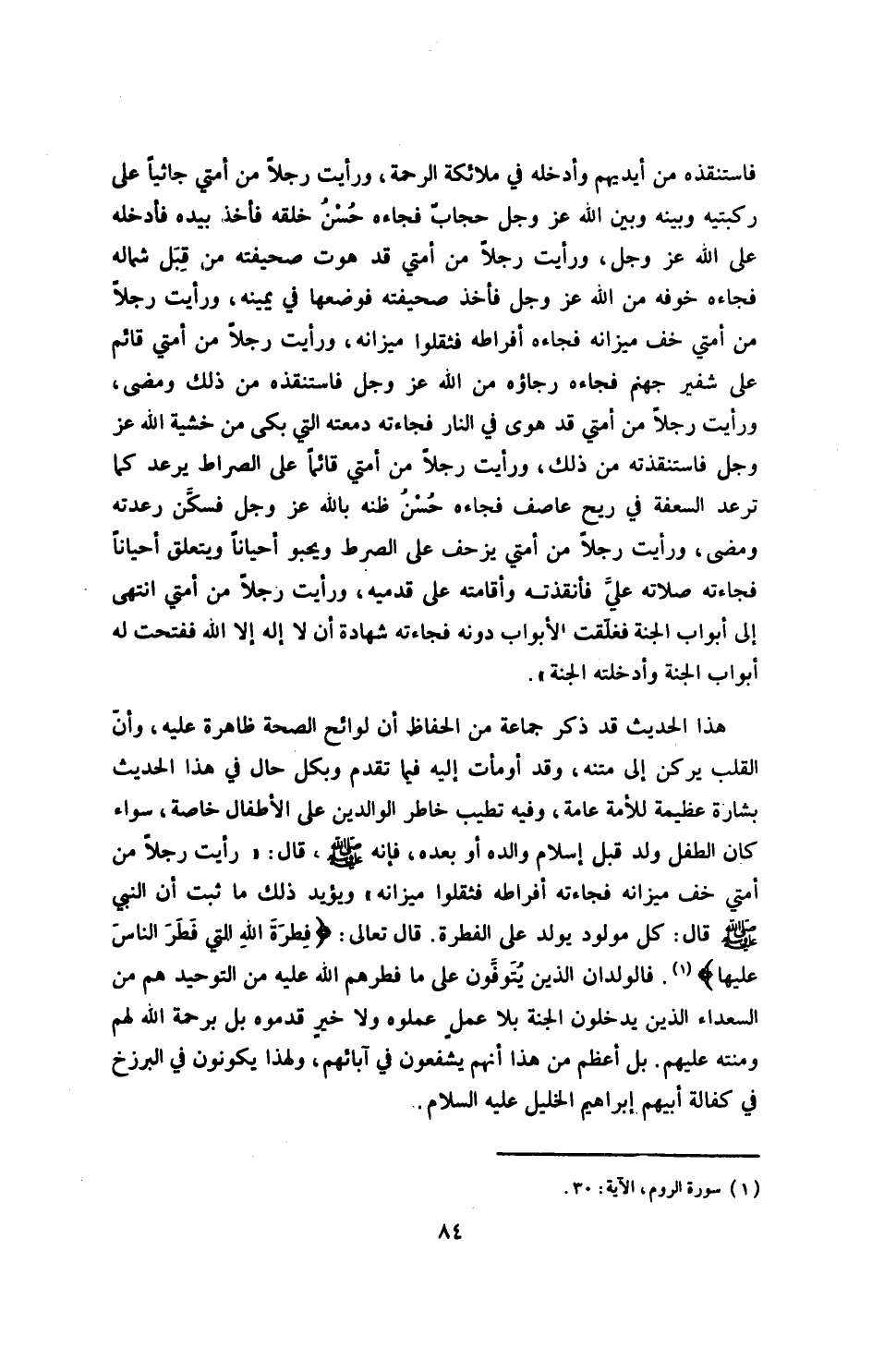 هذا الحديث قد ذكر جماعة من الحفاظ، أن لوائح الصحة ظاهرة عليه، وأن القلب يركن الى متنه، وقد أومأت إليه فيما تقدم وبكل حال، في هذا الحديث بشارة عظيمة للأمة عامة، وفيه تطيب خاطر الوالدين على الأطفال خاصة، سواء كان الطفل ولد قبل إسلام والده أو بعده، فإنه صلى الله عليه وسلم، قال: «رأيت رجلاً من أمتي خف ميزانه فجاءته أفراطه فثقلوا ميزانه» .