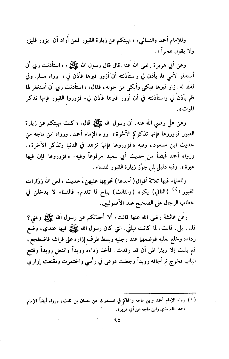 «وعن علي ـ رضي الله عنه ـ أن رسول الله صلى الله عليه وسلم قال: كنت نهيتكم عن زيارة القبور، فزوروها، فإنها تذكركم الآخرة» .