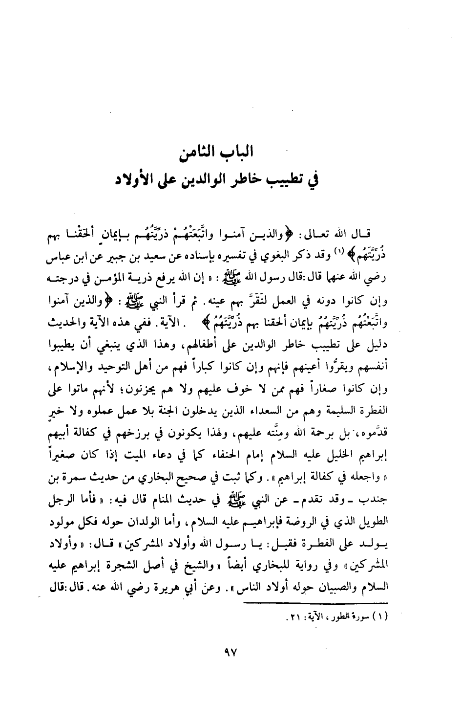 ففي هذه الآية والحديث، دليل على تطييب خاطر الوالدين على أطفالهم، وهذا الذي ينبغي، أن يطيبوا أنفسهم، ويقروا أعينهم، فإنهم، وإن كانوا كباراً، فهم من أهل التوحيد والإسلام، وإن كانوا صغاراً، فهم ممن: {لا خوف عليهم ولا هم يحزنون} ، لأنهم ماتوا على الفطرة السليمة، وهم من السعداء الذين يدخلون الجنة بلا عمل عملوه، ولا خير قدموه، بل رحمة الله ومنته عليهم، ولهذا يكونون في برزخهم في كفالة أبيهم إبراهيم الخليل ـ عليه السلام، إمام الحنفاء ـ كما في دعاء الميت إذا كان صغيراً: واجعله في كفالة إبراهيم.