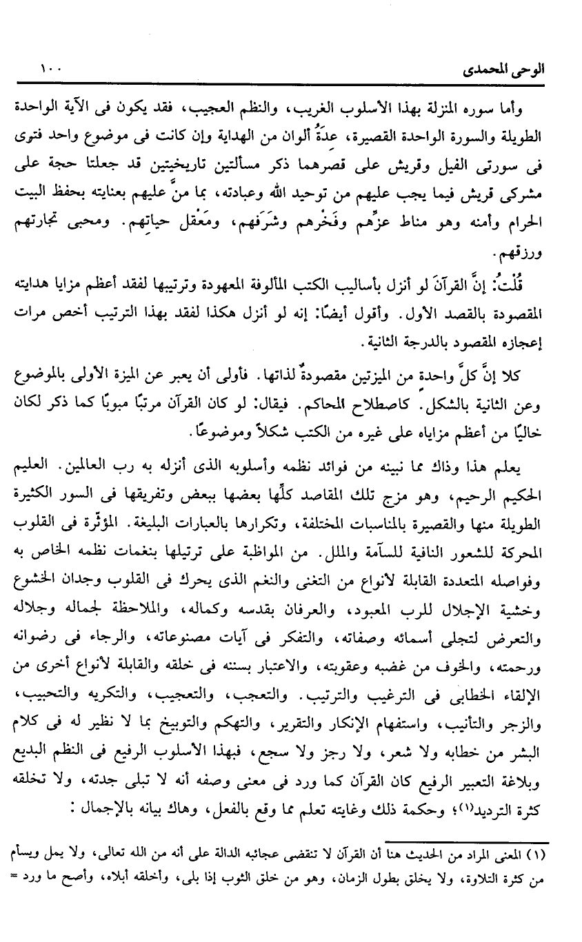 قلت: إنّ القرآن لو أنزل بأساليب الكتب المألوفة المعهودة وترتيبها لفقد أعظم مزايا هدايته المقصودة بالقصد الأول. وأقول أيضا: إنه لو أنزل هكذا لفقد بهذا الترتيب أخص مرات إعجازه المقصود بالدرجة الثانية.