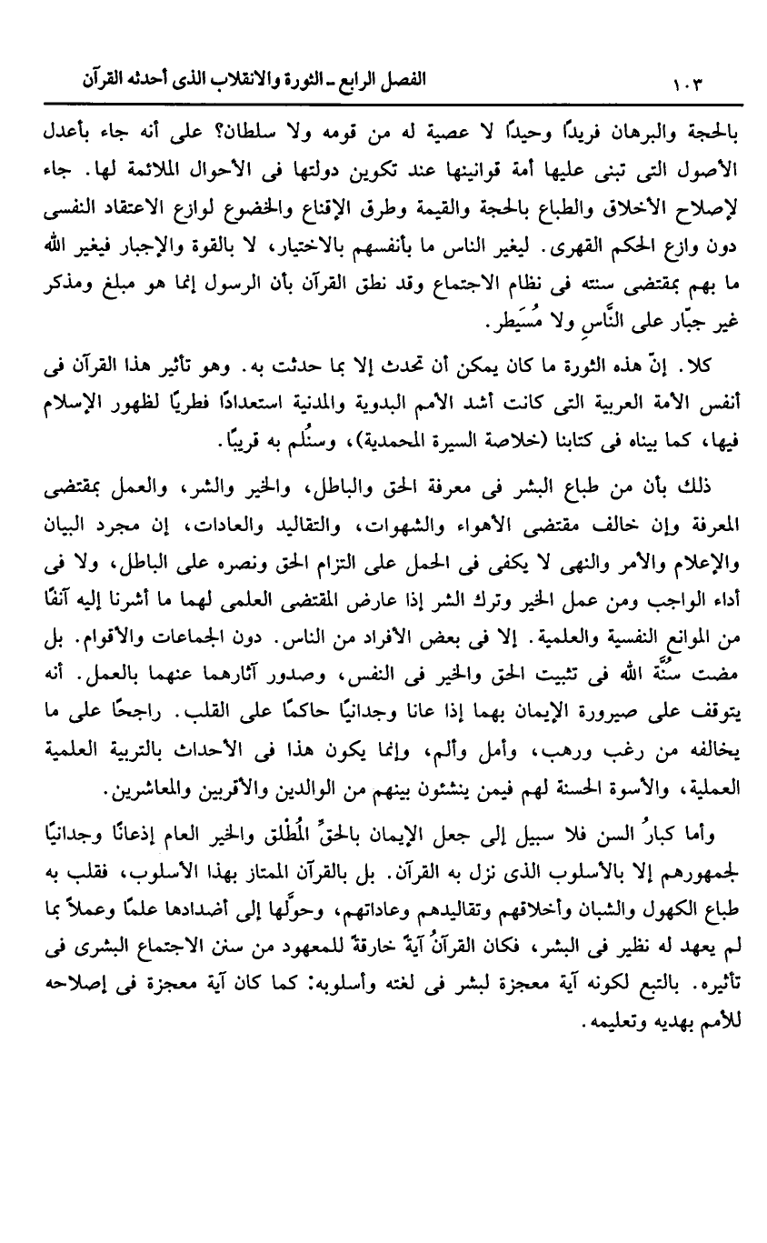 كلا. إنّ هذه الثورة ما كان يمكن أن تحدث إلا بما حدثت به. وهو تأثير هذا القرآن فى أنفس الأمة العربية التى كانت أشد الأمم البدوية والمدنية استعدادا فطريا لظهور الإسلام فيها، كما بيناه فى كتابنا (خلاصة السيرة المحمدية)، وسنلم به قريبا.