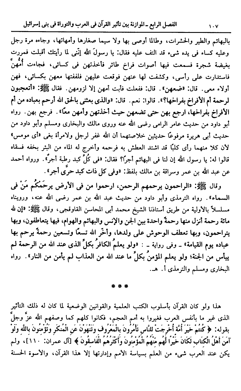 وقال صلّى الله عليه وسلم: «الراحمون يرحمهم الرحمن، ارحموا من فى الأرض يرحمكم من فى السماء». رواه الترمذى وأبو داود من حديث عبد الله بن عمر رضى الله عنه، ورويناه مسلسلا بالأولية من طريق أستاذنا الشيخ محمد أبى المحاسن القاوقجى، وقال صلّى الله عليه وسلم: «إن لله مائة رحمة أنزل منها رحمة واحدة بين الجن والإنس والبهائم والهوام، فيها يتعاطفون، وبها يتراحمون، وبها تعطف الوحوش على ولدها، وأخّر الله تسعا وتسعين رحمة يرحم بها عباده يوم القيامة» - وفى رواية-: «ولو يعلم الكافر بكلّ الذى عند الله من الرحمة لم ييأس من الجنة؛ ولو يعلم المؤمن بكلّ ما عند الله من العذاب لم يأمن من النار». رواه البخارى ومسلم والترمذى أ. هـ.