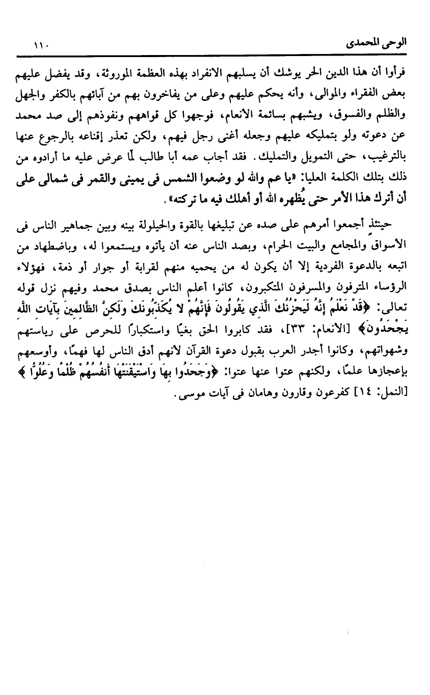 فرأوا أن هذا الدين الحر يوشك أن يسلبهم الانفراد بهذه العظمة الموروثة، وقد يفضل عليهم بعض الفقراء والموالى، وأنه يحكم عليهم وعلى من يفاخرون بهم من آبائهم بالكفر والجهل والظلم والفسوق، ويشبههم بسائمة الأنعام، فوجهوا كل قواهم ونفوذهم إلى صد محمد عن دعوته ولو بتمليكه عليهم وجعله أغنى رجل فيهم، ولكن تعذر إقناعه بالرجوع عنها بالترغيب، حتى التمويل والتمليك. فقد أجاب عمه أبا طالب لمّا عرض عليه ما أرادوه من ذلك بتلك الكلمة العليا: «يا عم والله لو وضعوا الشمس فى يمينى والقمر فى شمالى على أن أترك هذا الأمر حتى يظهره الله أو أهلك فيه ما تركته».