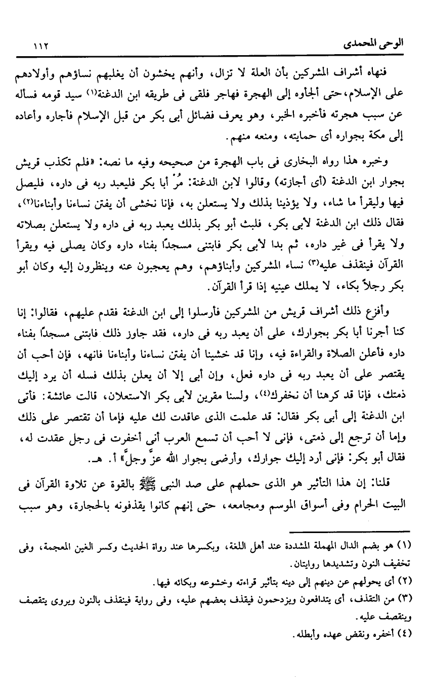 وأفزع ذلك أشراف قريش من المشركين فأرسلوا إلى ابن الدغنة فقدم عليهم، فقالوا: إنا كنا أجرنا أبا بكر بجوارك، على أن يعبد ربه فى داره، فقد جاوز ذلك فابتنى مسجدا بفناء داره فأعلن الصلاة والقراءة فيه، وإنا قد خشينا أن يفتن نساءنا وأبناءنا فانهه، فإن أحب أن يقتصر على أن يعبد ربه فى داره فعل، وإن أبى إلا أن يعلن بذلك فسله أن يرد إليك ذمتك، فإنا قد كرهنا أن نخفرك «4»، ولسنا مقرين لأبى بكر الاستعلان، قالت عائشة: فأتى ابن الدغنة إلى أبى بكر فقال: قد علمت الذى عاقدت لك عليه فإما أن تقتصر على ذلك وإما أن ترجع إلى ذمتى، فإنى لا أحب أن تسمع العرب أنى أخفرت فى رجل عقدت له، فقال أبو بكر: فإنى أرد إليك جوارك، وأرضى بجوار الله عزّ وجلّ» أ. هـ.