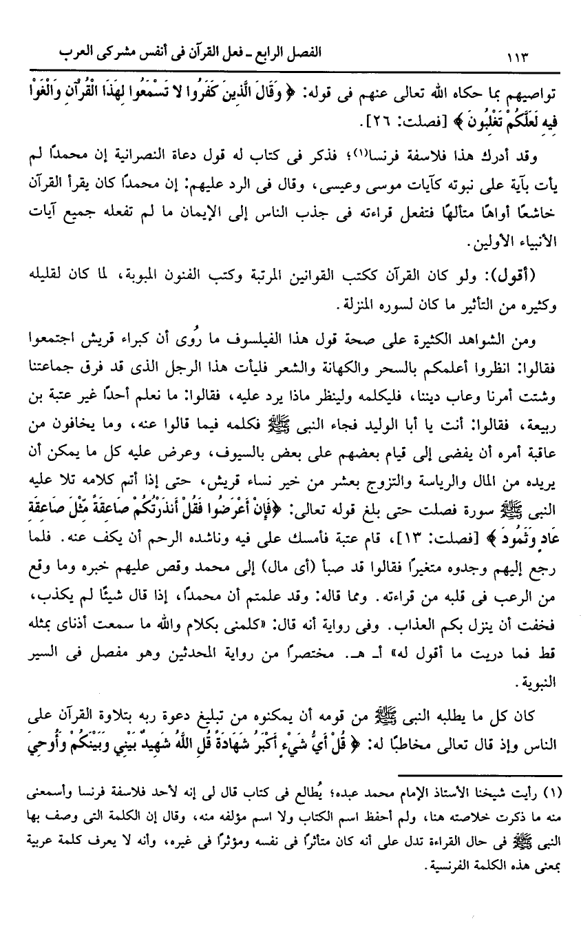 ومن الشواهد الكثيرة على صحة قول هذا الفيلسوف ما روى أن كبراء قريش اجتمعوا فقالوا: انظروا أعلمكم بالسحر والكهانة والشعر فليأت هذا الرجل الذى قد فرق جماعتنا وشئت أمرنا وعاب ديننا، فليكلمه ولينظر ماذا يرد عليه، فقالوا: ما نعلم أحدا غير عتبة بن ربيعة، فقالوا: أنت يا أبا الوليد فجاء النبى صلّى الله عليه وسلم فكلمه فيما قالوا عنه، وما يخافون من عاقبة أمره أن يفضى إلى قيام بعضهم على بعض بالسيوف، وعرض عليه كل ما يمكن أن يريده من المال والرئاسة والتزوج بعشر من خير نساء قريش، حتى إذا أتم كلامه تلا عليه النبى صلّى الله عليه وسلم سورة فصلت حتى بلغ قوله تعالى: فَإِنْ أَعْرَضُوا فَقُلْ أَنْذَرْتُكُمْ صاعِقَةً مِثْلَ صاعِقَةِ عادٍ وَثَمُودَ [فصلت: 13]، قام عتبة فأمسك على فيه وناشده الرحم أن يكف عنه. فلما رجع إليهم وجدوه متغيرا فقالوا قد صبأ (أى مال) إلى محمد وقص عليهم خبره وما وقع من الرعب فى قلبه من قراءته. ومما قاله: وقد علمتم أن محمدا، إذا قال شيئا لم يكذب، فخفت أن ينزل بكم العذاب. وفى رواية أنه قال: «كلمنى بكلام والله ما سمعت أذناى بمثله قط فما دريت ما أقول له» أ- هـ. مختصرا من رواية المحدثين وهو مفصل فى السير النبوية.