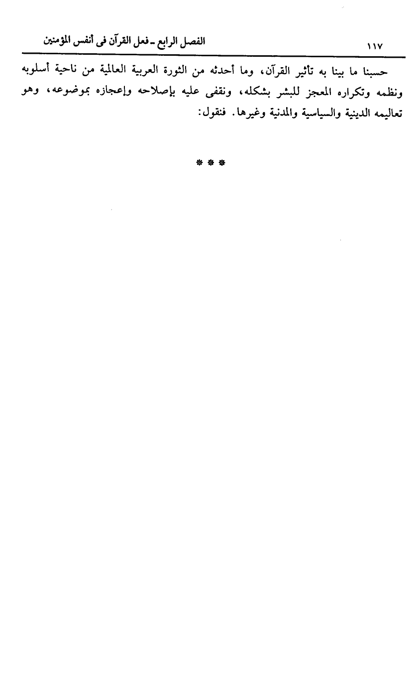حسبنا ما بينا به تأثير القرآن، وما أحدثه من الثورة العربية العالمية من ناحية أسلوبه ونظمه وتكراره المعجز للبشر بشكله، ونقفى عليه بإصلاحه وإعجازه بموضوعه، وهو تعاليمه الدينية والسياسية والمدنية وغيرها. فنقول: