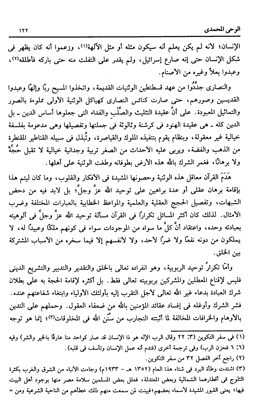 والنصارى جدّدوا من عهد قسطنطين الوثنيات القديمة، واتخذوا المسيح ربا وإلها وعبدوا القديسين وصورهم، حتى صارت كنائس النصارى كهياكل الوثنية الأولى مملوءة بالصور والتماثيل المعبودة. على أنّ عقيدة التثليث والصّلب والفداء التى جعلوها أساس الدين- بل الدين كله- هى عقيدة الهنود فى كرشنة وثالوثة فى جملتها وتفصيلها وهى مدعومة بفلسفة خيالية غير معقولة، وبنظام يقوم بتنفيذه الملوك والقياصرة، وتبذل فى سبيله القناطير المقنطرة من الذهب والفضة، ويربى عليه الأحداث من الصغر تربية وجدانية خيالية لا تقبل حجّة ولا برهانا، فغمر الشرك بالله هذه الأرض بطوفانه وطغت الوثنية على أهلها.