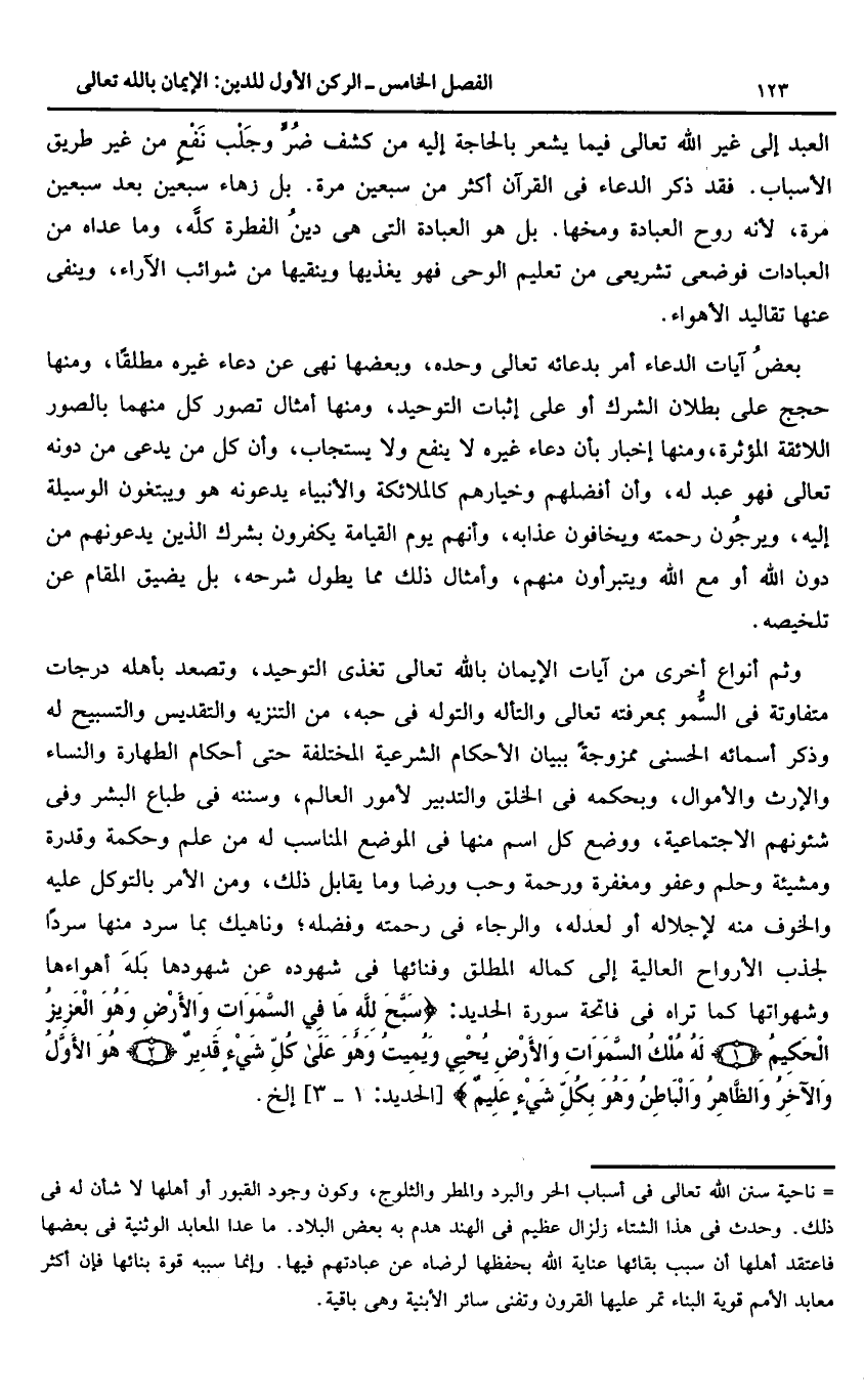 وثم أنواع أخرى من آيات الإيمان بالله تعالى تغذى التوحيد، وتصعد بأهله درجات متفاوتة فى السّمو بمعرفته تعالى والتأله والتوله فى حبه، من التنزيه والتقديس والتسبيح له وذكر أسمائه الحسنى ممزوجة ببيان الأحكام الشرعية المختلفة حتى أحكام الطهارة والنساء والإرث والأموال، وبحكمه فى الخلق والتدبير لأمور العالم، وسننه فى طباع البشر وفى شئونهم الاجتماعية، ووضع كل اسم منها فى الموضع المناسب له من علم وحكمة وقدرة ومشيئة وحلم وعفو ومغفرة ورحمة وحب ورضا وما يقابل ذلك، ومن الأمر بالتوكل عليه والخوف منه لإجلاله أو لعدله، والرجاء فى رحمته وفضله؛ وناهيك بما سرد منها سردا لجذب الأرواح العالية إلى كماله المطلق وفنائها فى شهوده عن شهودها بله أهواءها وشهواتها كما تراه فى فاتحة سورة الحديد: سَبَّحَ لِلَّهِ ما فِي السَّماواتِ وَالْأَرْضِ وَهُوَ الْعَزِيزُ الْحَكِيمُ (1) لَهُ مُلْكُ السَّماواتِ وَالْأَرْضِ يُحْيِي وَيُمِيتُ وَهُوَ عَلى كُلِّ شَيْءٍ قَدِيرٌ (2) هُوَ الْأَوَّلُ وَالْآخِرُ وَالظَّاهِرُ وَالْباطِنُ وَهُوَ بِكُلِّ شَيْءٍ عَلِيمٌ [الحديد: 1 - 3] إلخ.
