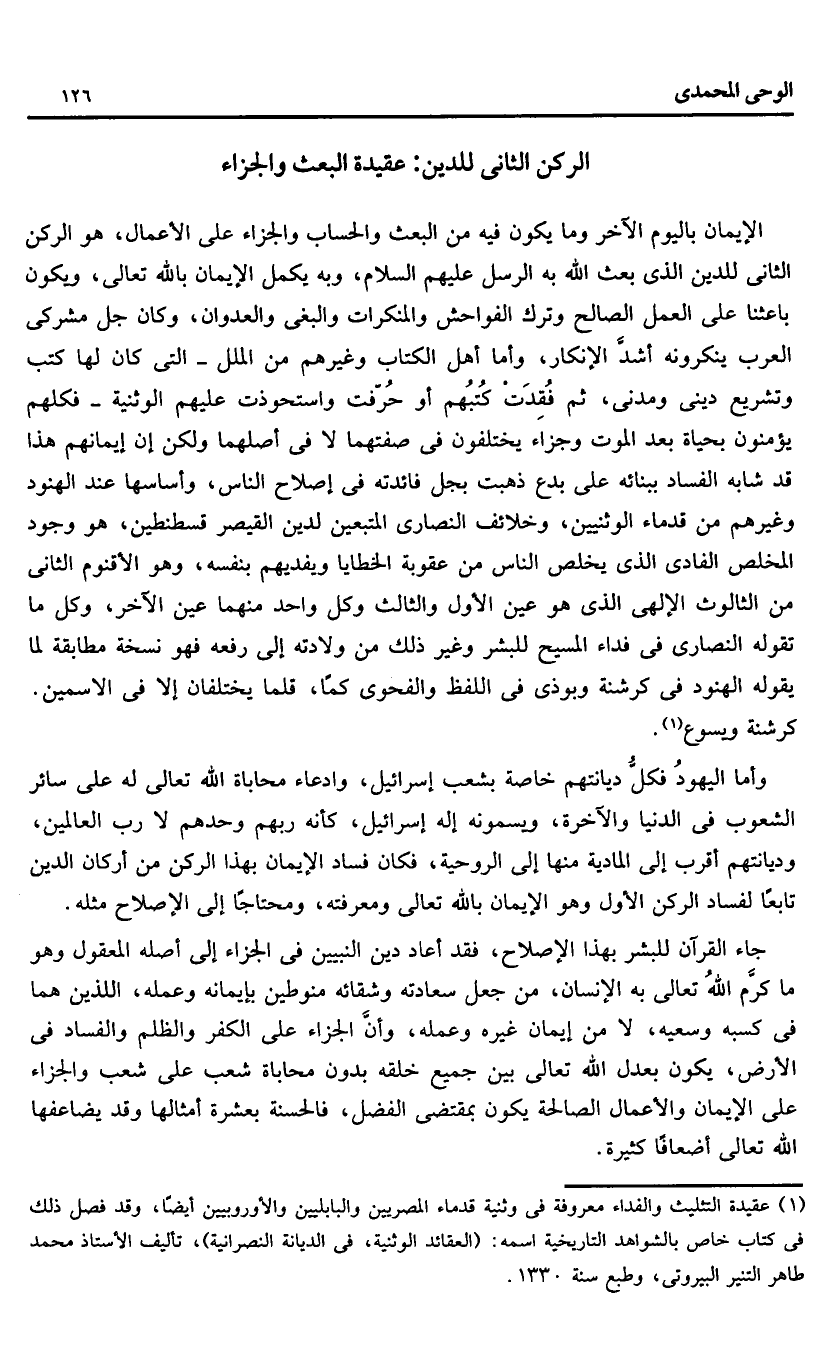 الإيمان باليوم الآخر وما يكون فيه من البعث والحساب والجزاء على الأعمال، هو الركن الثانى للدين الذى بعث الله به الرسل عليهم السلام، وبه يكمل الإيمان بالله تعالى، ويكون باعثنا على العمل الصالح وترك الفواحش والمنكرات والبغى والعدوان، وكان جل مشركى العرب ينكرونه أشدّ الإنكار، وأما أهل الكتاب وغيرهم من الملل- التى كان لها كتب وتشريع دينى ومدنى، ثم فقدت كتبهم أو حرّفت واستحوذت عليهم الوثنية- فكلهم يؤمنون بحياة بعد الموت وجزاء يختلفون فى صفتهما لا فى أصلهما ولكن إن إيمانهم هذا قد شابه الفساد ببنائه على بدع ذهبت بجل فائدته فى إصلاح الناس، وأساسها عند الهنود وغيرهم من قدماء الوثنيين، وخلائف النصارى المتبعين لدين القيصر قسطنطين، هو وجود المخلص الفادى الذى يخلص الناس من عقوبة الخطايا ويفديهم بنفسه، وهو الأقنوم الثانى من الثالوث الإلهى الذى هو عين الأول والثالث وكل واحد منهما عين الآخر، وكل ما تقوله النصارى فى فداء المسيح للبشر وغير ذلك من ولادته إلى رفعه فهو نسخة مطابقة لما يقوله الهنود فى كرشنة وبوذا فى اللفظ والفحوى كما، قلما يختلفان إلا فى الاسمين.