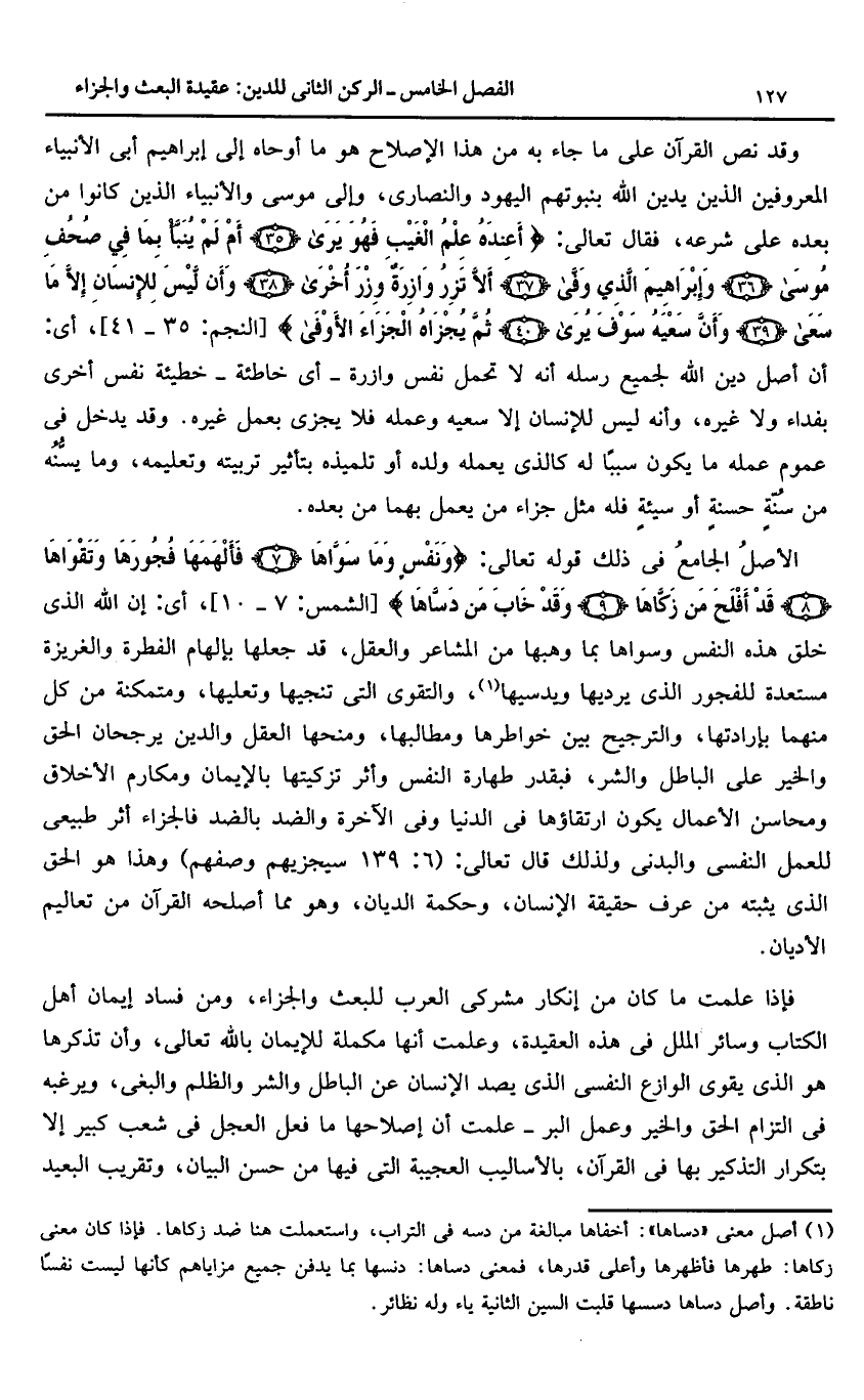 الأصل الجامع فى ذلك قوله تعالى: وَنَفْسٍ وَما سَوَّاها (7) فَأَلْهَمَها فُجُورَها وَتَقْواها (8) قَدْ أَفْلَحَ مَنْ زَكَّاها (9) وَقَدْ خابَ مَنْ دَسَّاها [الشمس: 7 - 10]، أى: إن الله الذى خلق هذه النفس وسواها بما وهبها من المشاعر والعقل، قد جعلها بإلهام الفطرة والغريزة مستعدة للفجور الذى يرديها ويدسيها «1»، والتقوى التى تنجيها وتعليها، ومتمكنة من كل منهما بإرادتها، والترجيح بين خواطرها ومطالبها، ومنحها العقل والدين يرجحان الحق والخير على الباطل والشر، فبقدر طهارة النفس وأثر تزكيتها بالإيمان ومكارم الأخلاق ومحاسن الأعمال يكون ارتقاؤها فى الدنيا وفى الآخرة والضد بالضد فالجزاء أثر طبيعى للعمل النفسى والبدنى ولذلك قال تعالى: (6: 139 سيجزيهم وصفهم) وهذا هو الحق الذى يثبته من عرف حقيقة الإنسان، وحكمة الديان، وهو مما أصلحه القرآن من تعاليم الأديان.