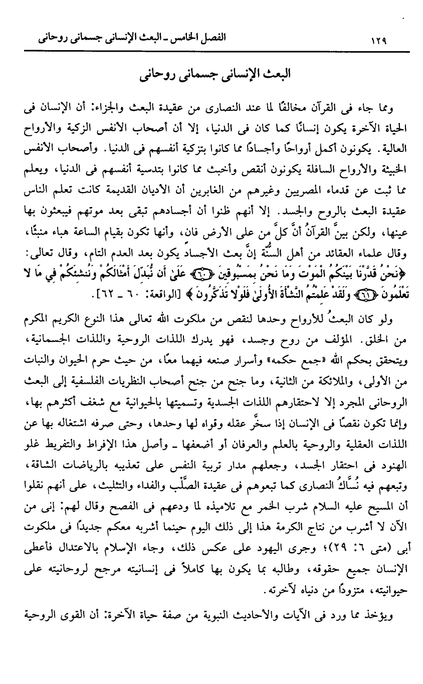ولو كان البعث للأرواح وحدها لنقص من ملكوت الله تعالى هذا النوع الكريم المكرم من الخلق. المؤلف من روح وجسد، فهو يدرك اللذات الروحية واللذات الجسمانية، ويتحقق بحكم الله «جمع حكمه» وأسرار صنعه فيهما معا، من حيث حرم الحيوان والنبات من الأولى، والملائكة من الثانية، وما جنح من جنح أصحاب النظريات الفلسفية إلى البعث الروحانى المجرد إلا لاحتقارهم اللذات الجسدية وتسميتها بالحيوانية مع شغف أكثرهم بها، وإنما تكون نقصا فى الإنسان إذا سخّر عقله وقواه لها وحدها، وحتى صرفه اشتغاله بها عن اللذات العقلية والروحية بالعلم والعرفان أو أضعفها- وأصل هذا الإفراط والتفريط غلو الهنود فى احتقار الجسد، وجعلهم مدار تربية النفس على تعذيبه بالرياضات الشاقة، وتبعهم فيه نسّاك النصارى كما تبعوهم فى عقيدة الصّلب والفداء والتثليث، على أنهم نقلوا أن المسيح عليه السلام شرب الخمر مع تلاميذه لما ودعهم فى الفصح وقال لهم: إنى من الآن لا أشرب من نتاج الكرمة هذا إلى ذلك اليوم حينما أشربه معكم جديدا فى ملكوت أبى (متى 6: 29)؛ وجرى اليهود على عكس ذلك، وجاء الإسلام بالاعتدال فأعطى الإنسان جميع حقوقه، وطالبه بما يكون بها كاملا فى إنسانيته مرجح لروحانيته على حيوانيته، متزودا من دنياه لآخرته.