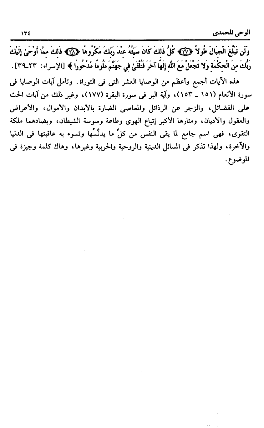 وَلَنْ تَبْلُغَ الْجِبالَ طُولًا (37) كُلُّ ذلِكَ كانَ سَيِّئُهُ عِنْدَ رَبِّكَ مَكْرُوهاً (38) ذلِكَ مِمَّا أَوْحى إِلَيْكَ رَبُّكَ مِنَ الْحِكْمَةِ وَلا تَجْعَلْ مَعَ اللَّهِ إِلهاً آخَرَ فَتُلْقى فِي جَهَنَّمَ مَلُوماً مَدْحُوراً [الإسراء: 23 - 39].