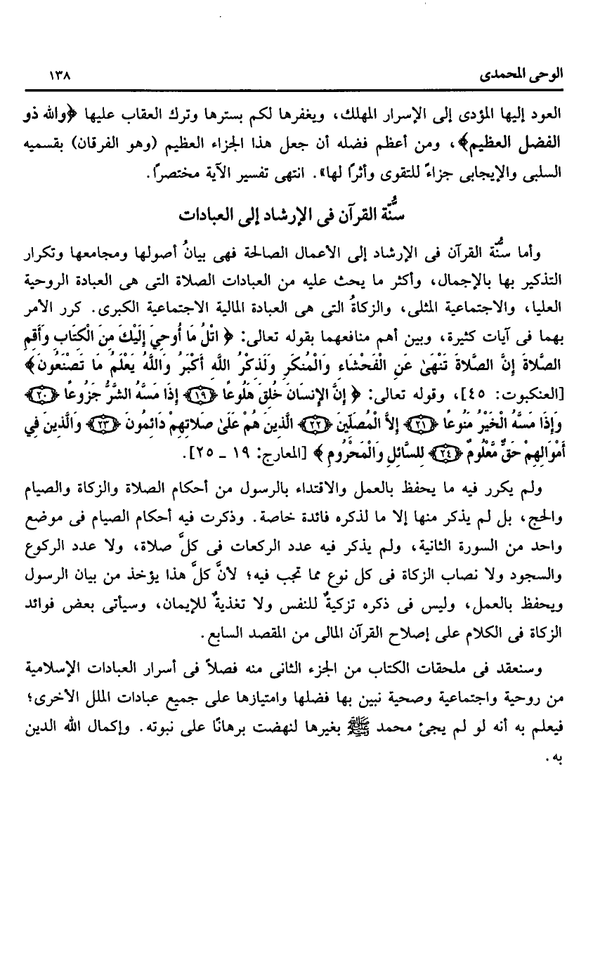 وأما سنّة القرآن فى الإرشاد إلى الأعمال الصالحة فهى بيان أصولها ومجامعها وتكرار التذكير بها بالإجمال، وأكثر ما يحث عليه من العبادات الصلاة التى هى العبادة الروحية العليا، والاجتماعية المثلى، والزكاة التى هى العبادة المالية الاجتماعية الكبرى. كرر الأمر بهما فى آيات كثيرة، وبين أهم منافعهما بقوله تعالى: اتْلُ ما أُوحِيَ إِلَيْكَ مِنَ الْكِتابِ وَأَقِمِ الصَّلاةَ إِنَّ الصَّلاةَ تَنْهى عَنِ الْفَحْشاءِ وَالْمُنْكَرِ وَلَذِكْرُ اللَّهِ أَكْبَرُ وَاللَّهُ يَعْلَمُ ما تَصْنَعُونَ [العنكبوت: 45]، وقوله تعالى: إِنَّ الْإِنْسانَ خُلِقَ هَلُوعاً (19) إِذا مَسَّهُ الشَّرُّ جَزُوعاً (20) وَإِذا مَسَّهُ الْخَيْرُ مَنُوعاً (21) إِلَّا الْمُصَلِّينَ (22) الَّذِينَ هُمْ عَلى صَلاتِهِمْ دائِمُونَ (23) وَالَّذِينَ فِي أَمْوالِهِمْ حَقٌّ مَعْلُومٌ (24) لِلسَّائِلِ وَالْمَحْرُومِ [المعارج: 19 - 25].