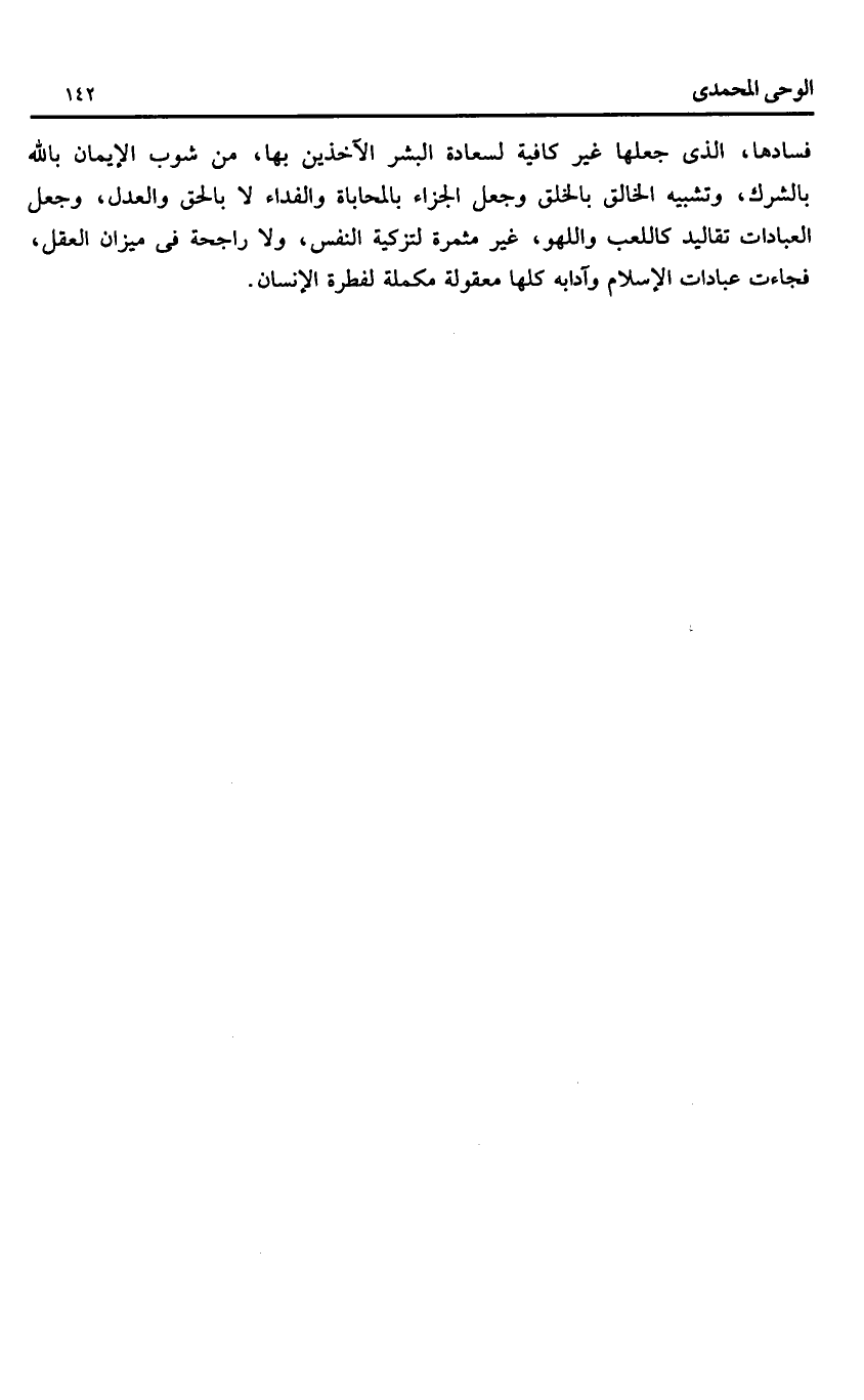 فسادها، الذى جعلها غير كافية لسعادة البشر الآخذين بها، من شوب الإيمان بالله بالشرك، وتشبيه الخالق بالخلق وجعل الجزاء بالمحاباة والفداء لا بالحق والعدل، وجعل العبادات تقاليد كاللعب واللهو، غير مثمرة لتزكية النفس، ولا راجحة فى ميزان العقل، فجاءت عبادات الإسلام وآدابه كلها معقولة مكملة لفطرة الإنسان.