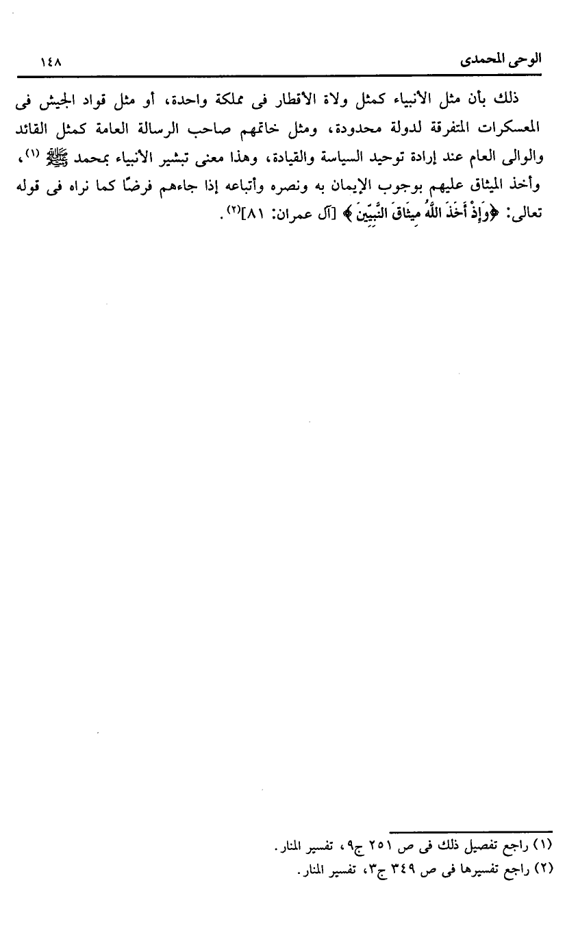ذلك بأن مثل الأنبياء كمثل ولاة الأقطار فى مملكة واحدة، أو مثل قواد الجيش فى المعسكرات المتفرقة لدولة محدودة، ومثل خاتمهم صاحب الرسالة العامة كمثل القائد والوالى العام عند إرادة توحيد السياسة والقيادة، وهذا معنى تبشير الأنبياء بمحمد صلّى الله عليه وسلّم «1»، وأخذ الميثاق عليهم بوجوب الإيمان به ونصره وأتباعه إذا جاءهم فرضا كما نراه فى قوله تعالى: وَإِذْ أَخَذَ اللَّهُ مِيثاقَ النَّبِيِّينَ [آل عمران: 81] «2».