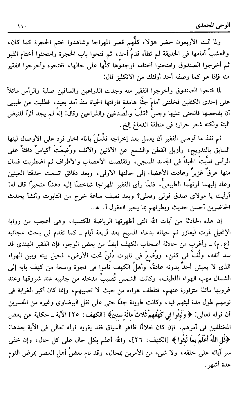 إن هذه الحادثة من آيات الله التى أظهرتها الرياضة المكتسبة، وهى أعجب من رواية الإنجيل لموت ليعازر ثم حياته بدعاء المسيح بعد أربعة أيام- كما تقدم فى بحث عجائبه (ع. م) - وأغرب من حادثة أصحاب الكهف أيضا من بعض الوجوه فإن الفقير الهندى قد سد أنفه، ولفّ فى كفن، ووضع فى تابوت دفن تحت الأرض، فحيل بينه وبين الهواء الذى لا يعيش أحد بدونه عادة، وأهل الكهف ناموا فى فجوة واسعة من كهف بابه إلى الشمال مهب الهواء اللطيف، وكانت الشمس تصيب مدخله من جانبيه عند شروقها وعند غروبها مائلة متزاورة عنهم، فتلطف هواءه من حيث لا تصيبهم، وإنما كان أكبر الغرابة فى نومهم طول مدة لبثهم فيه، وكانت طويلة جدا حتى على نقل البيضاوى وغيره من المفسرين أن قوله تعالى: وَلَبِثُوا فِي كَهْفِهِمْ ثَلاثَ مِائَةٍ سِنِينَ [الكهف: 25] الآية- حكاية عن بعض المختلفين فى أمرهم، فإن كان خلافا ظاهر السياق فقد يقويه قوله تعالى فى الآية بعدها: