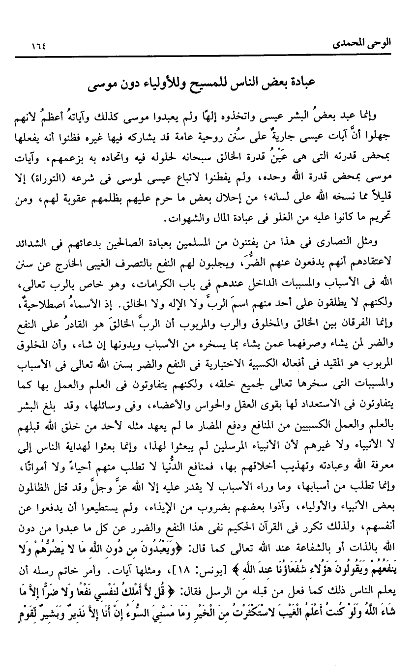 ومثل النصارى فى هذا من يفتنون من المسلمين بعبادة الصالحين بدعائهم فى الشدائد لاعتقادهم أنهم يدفعون عنهم الضرّ، ويجلبون لهم النفع بالتصرف الغيبى الخارج عن سنن الله فى الأسباب والمسببات الداخل عندهم فى باب الكرامات، وهو خاص بالرب تعالى، ولكنهم لا يطلقون على أحد منهم اسم الربّ ولا الإله ولا الخالق. إذ الأسماء اصطلاحية، وإنما الفرقان بين الخالق والمخلوق والرب والمربوب أن الربّ الخالق هو القادر على النفع والضر لمن يشاء وصرفهما عمن يشاء بما يسخره من الأسباب وبدونها إن شاء، وأن المخلوق المربوب هو المقيد فى أفعاله الكسبية الاختيارية فى النفع والضر بسنن الله تعالى فى الأسباب والمسببات التى سخرها تعالى لجميع خلقه، ولكنهم يتفاوتون فى العلم والعمل بها كما يتفاوتون فى الاستعداد لها بقوى العقل والحواس والأعضاء، وفى وسائلها، وقد بلغ البشر بالعلم والعمل الكسبيين من المنافع ودفع المضار ما لم يعهد مثله لأحد من خلق الله قبلهم لا الأنبياء ولا غيرهم لأن الأنبياء المرسلين لم يبعثوا لهذا، وإنما بعثوا لهداية الناس إلى معرفة الله وعبادته وتهذيب أخلاقهم بها، فمنافع الدّنيا لا تطلب منهم أحياء ولا أمواتا، وإنما تطلب من أسبابها، وما وراء الأسباب لا يقدر عليه إلا الله عزّ وجلّ وقد قتل الظالمون بعض الأنبياء والأولياء، وآذوا بعضهم بضروب من الإيذاء، ولم يستطيعوا أن يدفعوا عن أنفسهم، ولذلك تكرر فى القرآن الحكيم نفى هذا النفع والضرر عن كل ما عبدوا من دون الله بالذات أو بالشفاعة عند الله تعالى كما قال: وَيَعْبُدُونَ مِنْ دُونِ اللَّهِ ما لا يَضُرُّهُمْ وَلا يَنْفَعُهُمْ وَيَقُولُونَ هؤُلاءِ شُفَعاؤُنا عِنْدَ اللَّهِ [يونس: 18]، ومثلها آيات. وأمر خاتم رسله أن يعلم الناس ذلك كما فعل من قبله من الرسل فقال: قُلْ لا أَمْلِكُ لِنَفْسِي نَفْعاً وَلا ضَرًّا إِلَّا ما شاءَ اللَّهُ وَلَوْ كُنْتُ أَعْلَمُ الْغَيْبَ لَاسْتَكْثَرْتُ مِنَ الْخَيْرِ وَما مَسَّنِيَ السُّوءُ إِنْ أَنَا إِلَّا نَذِيرٌ وَبَشِيرٌ لِقَوْمٍ