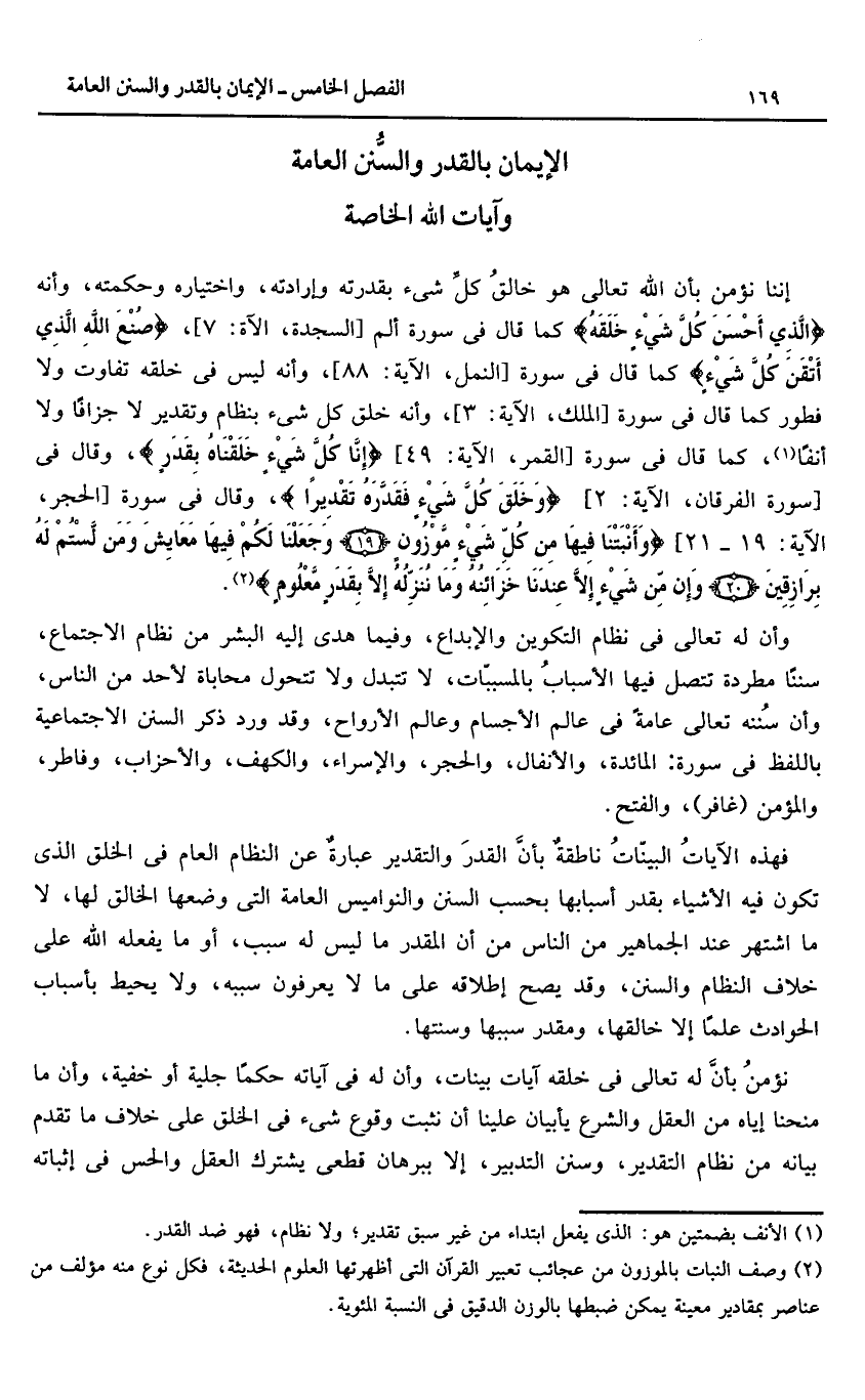 إننا نؤمن بأن الله تعالى هو خالق كلّ شىء بقدرته وإرادته، واختياره وحكمته، وأنه الَّذِي أَحْسَنَ كُلَّ شَيْءٍ خَلَقَهُ كما قال فى سورة الم [السجدة، الآية: 7]، صُنْعَ اللَّهِ الَّذِي أَتْقَنَ كُلَّ شَيْءٍ كما قال فى سورة [النمل، الآية: 88]، وأنه ليس فى خلقه تفاوت ولا فطور كما قال فى سورة [الملك، الآية: 3]، وأنه خلق كل شىء بنظام وتقدير لا جزافا ولا أنفا «1»، كما قال فى سورة [القمر، الآية: 49] إِنَّا كُلَّ شَيْءٍ خَلَقْناهُ بِقَدَرٍ، وقال فى [سورة الفرقان، الآية: 2] وَخَلَقَ كُلَّ شَيْءٍ فَقَدَّرَهُ تَقْدِيراً، وقال فى سورة [الحجر، الآية: 19 - 21] وَأَنْبَتْنا فِيها مِنْ كُلِّ شَيْءٍ مَوْزُونٍ (19) وَجَعَلْنا لَكُمْ فِيها مَعايِشَ وَمَنْ لَسْتُمْ لَهُ بِرازِقِينَ (20) وَإِنْ مِنْ شَيْءٍ إِلَّا عِنْدَنا خَزائِنُهُ وَما نُنَزِّلُهُ إِلَّا بِقَدَرٍ مَعْلُومٍ «2».