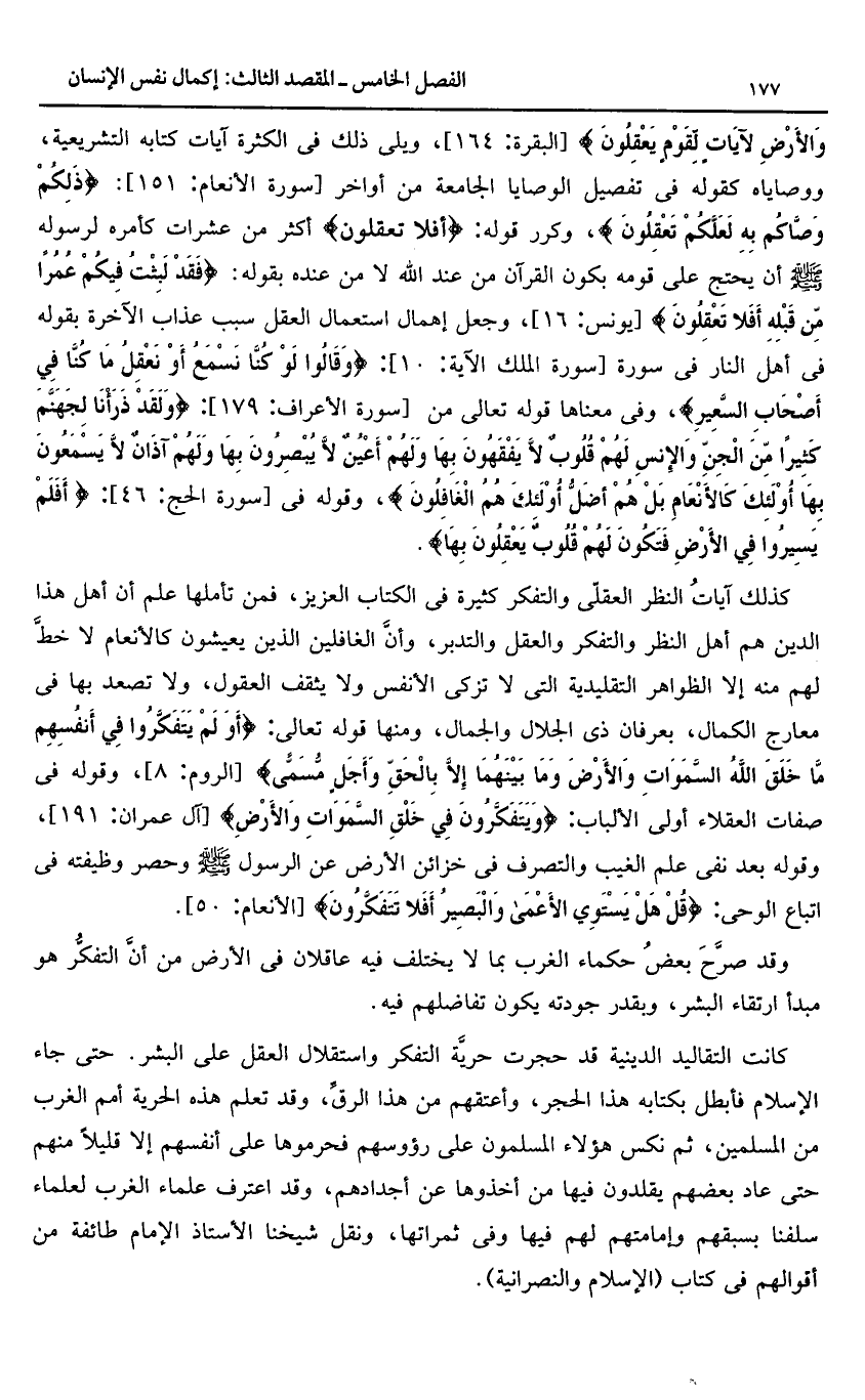 كذلك آيات النظر العقليّ والتفكر كثيرة فى الكتاب العزيز، فمن تأملها علم أن أهل هذا الدين هم أهل النظر والتفكر والعقل والتدبر، وأنّ الغافلين الذين يعيشون كالأنعام لا خطّ لهم منه إلا الظواهر التقليدية التى لا تزكى الأنفس ولا يثقف العقول، ولا تصعد بها فى معارج الكمال، بعرفان ذى الجلال والجمال، ومنها قوله تعالى: أَوَلَمْ يَتَفَكَّرُوا فِي أَنْفُسِهِمْ ما خَلَقَ اللَّهُ السَّماواتِ وَالْأَرْضَ وَما بَيْنَهُما إِلَّا بِالْحَقِّ وَأَجَلٍ مُسَمًّى [الروم: 8]، وقوله فى صفات العقلاء أولى الألباب: وَيَتَفَكَّرُونَ فِي خَلْقِ السَّماواتِ وَالْأَرْضِ [آل عمران: 191]، وقوله بعد نفى علم الغيب والتصرف فى خزائن الأرض عن الرسول صلّى الله عليه وسلّم وحصر وظيفته فى اتباع الوحى: قُلْ هَلْ يَسْتَوِي الْأَعْمى وَالْبَصِيرُ أَفَلا تَتَفَكَّرُونَ [الأنعام: 50].