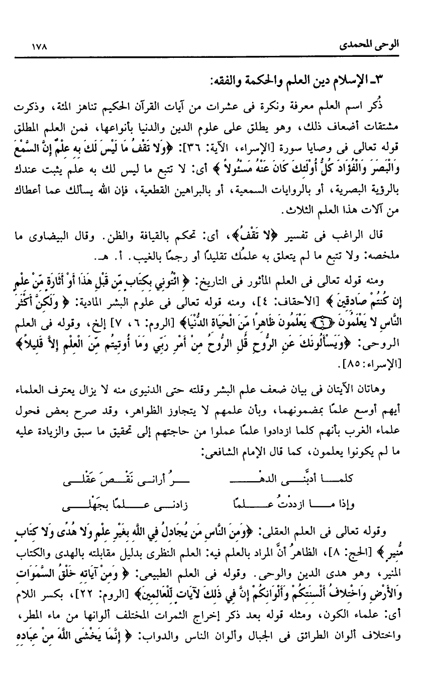 ومنه قوله تعالى فى العلم المأثور فى التاريخ: ائْتُونِي بِكِتابٍ مِنْ قَبْلِ هذا أَوْ أَثارَةٍ مِنْ عِلْمٍ إِنْ كُنْتُمْ صادِقِينَ [الأحقاف: 4]، ومنه قوله تعالى فى علوم البشر المادية: وَلكِنَّ أَكْثَرَ النَّاسِ لا يَعْلَمُونَ (6) يَعْلَمُونَ ظاهِراً مِنَ الْحَياةِ الدُّنْيا [الروم: 6، 7] إلخ، وقوله فى العلم الروحى: وَيَسْئَلُونَكَ عَنِ الرُّوحِ قُلِ الرُّوحُ مِنْ أَمْرِ رَبِّي وَما أُوتِيتُمْ مِنَ الْعِلْمِ إِلَّا قَلِيلًا [الإسراء: 85].