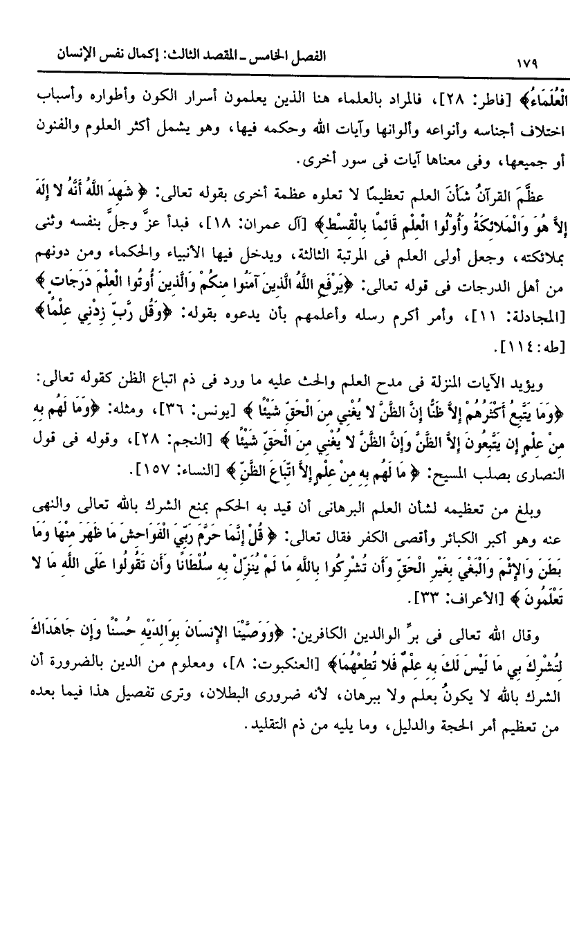 وبلغ من تعظيمه لشأن العلم البرهانى أن قيد به الحكم بمنع الشرك بالله تعالى والنهى عنه وهو أكبر الكبائر وأقصى الكفر فقال تعالى: قُلْ إِنَّما حَرَّمَ رَبِّيَ الْفَواحِشَ ما ظَهَرَ مِنْها وَما بَطَنَ وَالْإِثْمَ وَالْبَغْيَ بِغَيْرِ الْحَقِّ وَأَنْ تُشْرِكُوا بِاللَّهِ ما لَمْ يُنَزِّلْ بِهِ سُلْطاناً وَأَنْ تَقُولُوا عَلَى اللَّهِ ما لا تَعْلَمُونَ [الأعراف: 33].