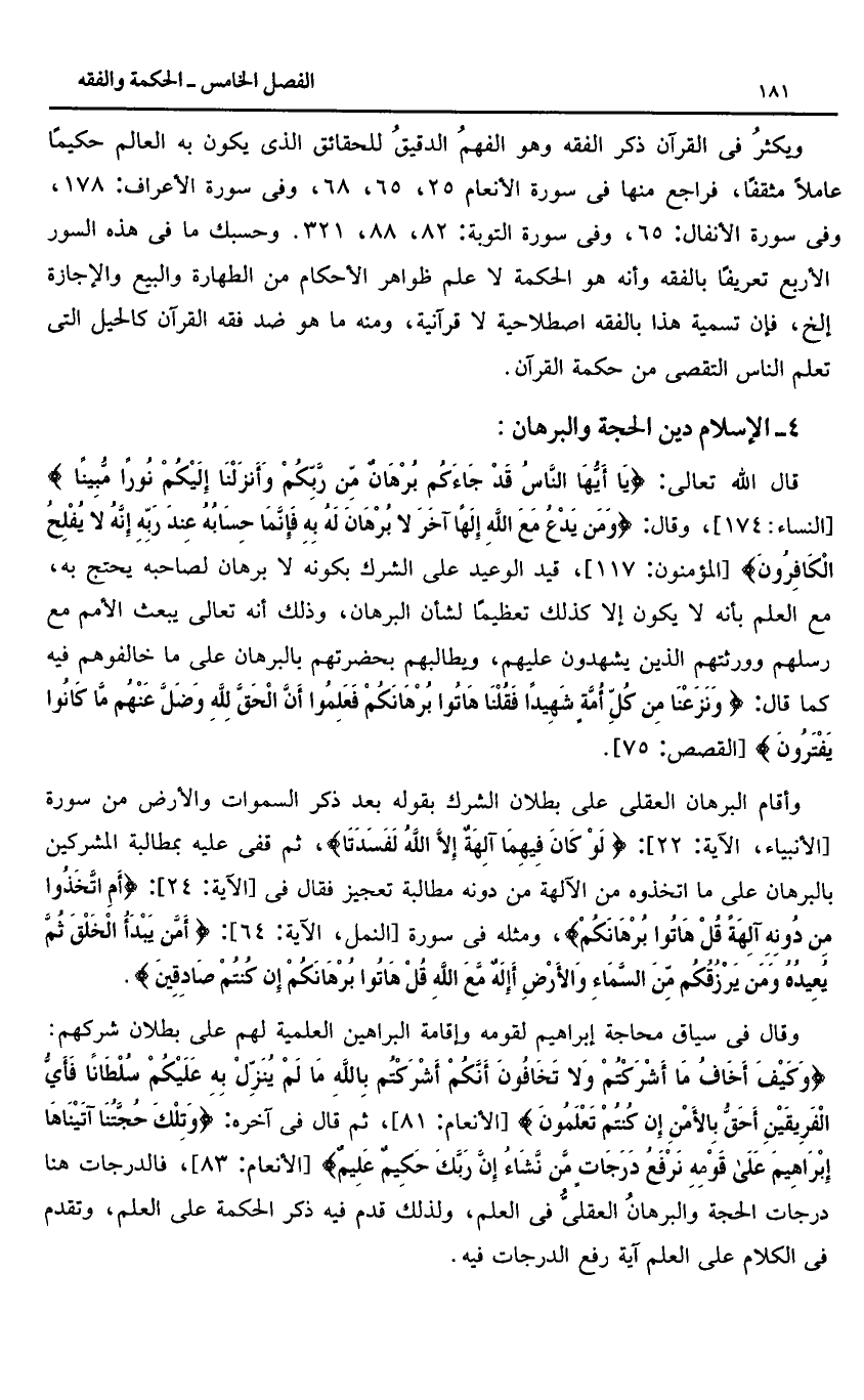 سورة الأنفال: 65، وفى سورة التوبة: 82، 88، 321. وحسبك ما فى هذه السور الأربع تعريفا بالفقه وأنه هو الحكمة لا علم ظواهر الأحكام من الطهارة والبيع والإجازة إلخ، فإن تسمية هذا بالفقه اصطلاحية لا قرآنية، ومنه ما هو ضد فقه القرآن كالحيل التى تعلم الناس التقصى من حكمة القرآن.