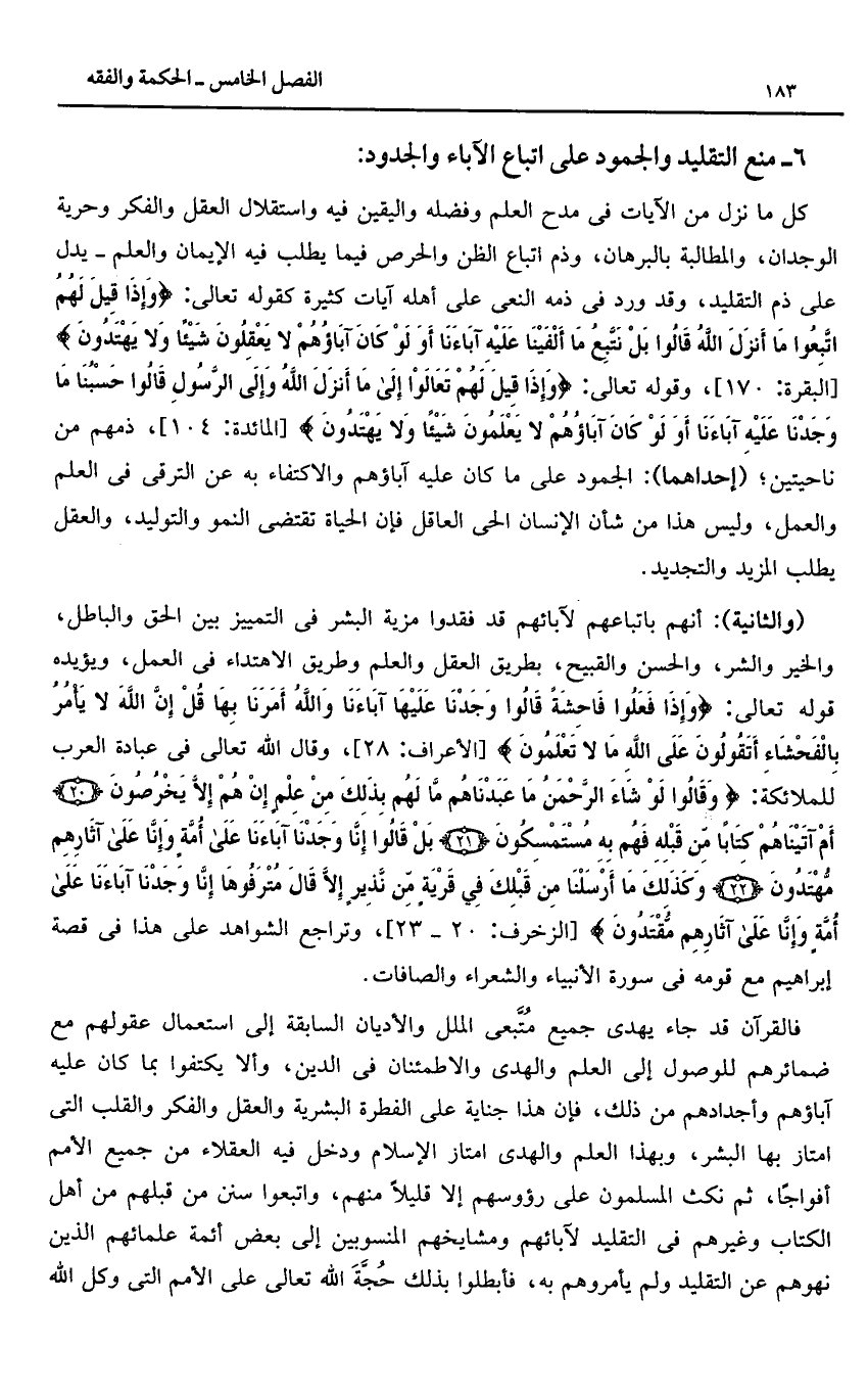 فالقرآن قد جاء يهدى جميع متّبعى الملل والأديان السابقة إلى استعمال عقولهم مع ضمائرهم للوصول إلى العلم والهدى والاطمئنان فى الدين، وألا يكتفوا بما كان عليه آباؤهم وأجدادهم من ذلك، فإن هذا جناية على الفطرة البشرية والعقل والفكر والقلب التى امتاز بها البشر، وبهذا العلم والهدى امتاز الإسلام ودخل فيه العقلاء من جميع الأمم أفواجا، ثم نكث المسلمون على رءوسهم إلا قليلا منهم، واتبعوا سنن من قبلهم من أهل الكتاب وغيرهم فى التقليد لآبائهم ومشايخهم المنسوبين إلى بعض أئمة علمائهم الذين نهوهم عن التقليد ولم يأمروهم به، فأبطلوا بذلك حجّة الله تعالى على الأمم التى وكل الله