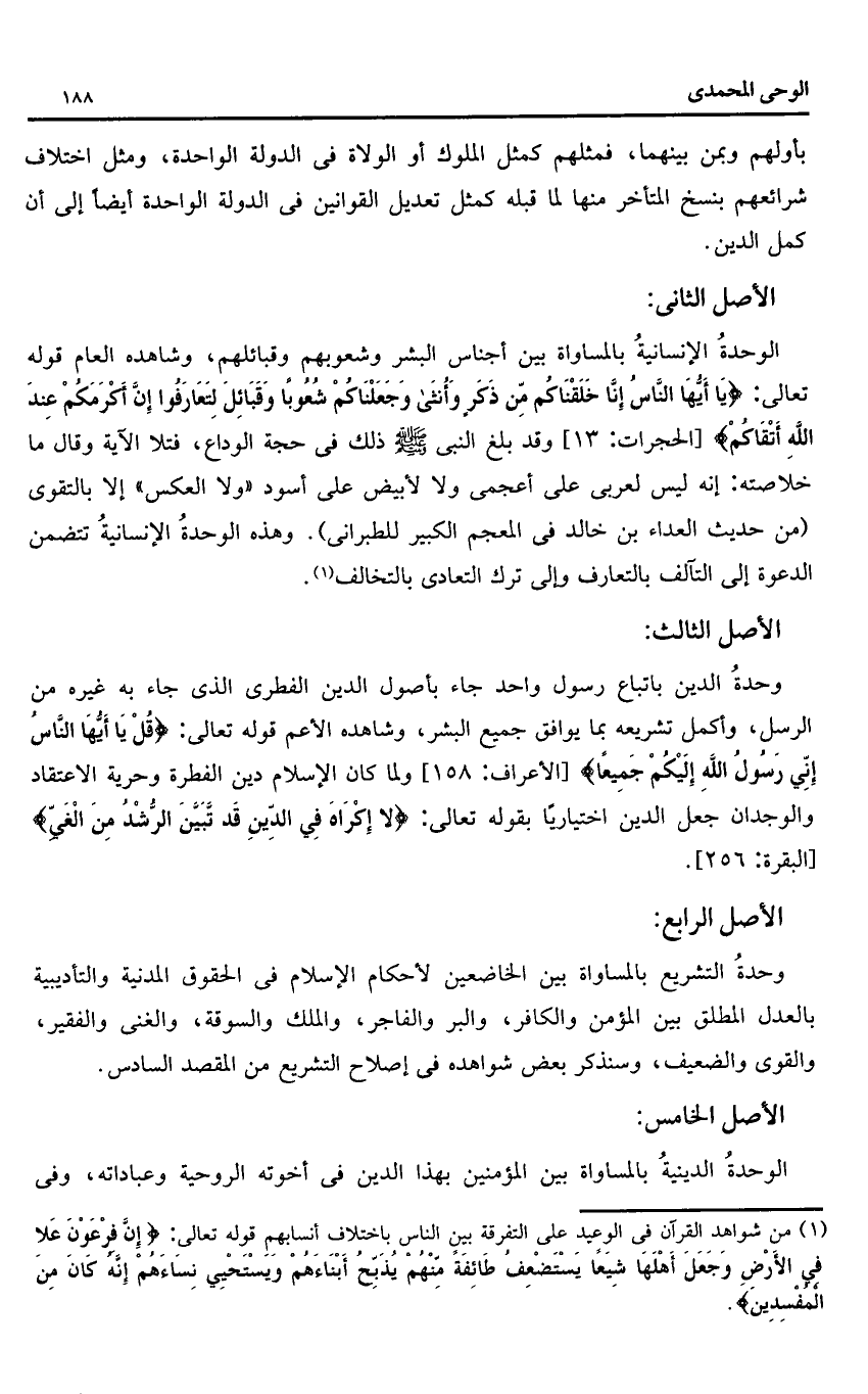 الوحدة الإنسانية بالمساواة بين أجناس البشر وشعوبهم وقبائلهم، وشاهده العام قوله تعالى: يا أَيُّهَا النَّاسُ إِنَّا خَلَقْناكُمْ مِنْ ذَكَرٍ وَأُنْثى وَجَعَلْناكُمْ شُعُوباً وَقَبائِلَ لِتَعارَفُوا إِنَّ أَكْرَمَكُمْ عِنْدَ اللَّهِ أَتْقاكُمْ [الحجرات: 13] وقد بلغ النبى صلّى الله عليه وسلّم ذلك فى حجة الوداع، فتلا الآية وقال ما خلاصته: إنه ليس لعربى على أعجمى ولا لأبيض على