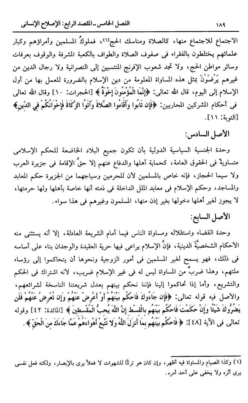 الاجتماع للاجتماع منها، كالصلاة ومناسك الحج «1»، فملوك المسلمين وأمراؤهم وكبار علمائهم يختلطون بالفقراء فى صفوف الصلاة والطواف بالكعبة المشرفة والوقوف بعرفات وسائر مواطن الحج، ولا تجد شعوب الإفرنج المنتسبين إلى النصرانية ولا رجال الدين من غيرهم يرضون بمثل هذه المساواة المعلومة من دين الإسلام بالضرورة للعمل بها من أول الإسلام إلى اليوم، قال الله تعالى: إِنَّمَا الْمُؤْمِنُونَ إِخْوَةٌ [الحجرات: 10] وقال الله تعالى فى أحكام المشركين المحاربين: فَإِنْ تابُوا وَأَقامُوا الصَّلاةَ وَآتَوُا الزَّكاةَ فَإِخْوانُكُمْ فِي الدِّينِ [التوبة: 11].