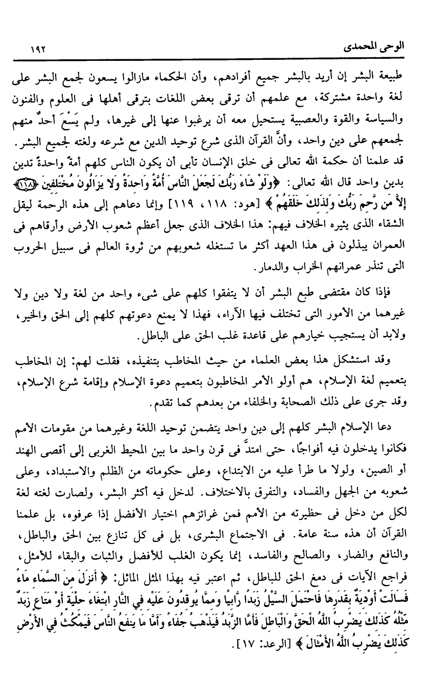 طبيعة البشر إن أريد بالبشر جميع أفرادهم، وأن الحكماء ما زالوا يسعون لجمع البشر على لغة واحدة مشتركة، مع علمهم أن ترقى بعض اللغات بترقى أهلها فى العلوم والفنون والسياسة والقوة والعصبية يستحيل معه أن يرغبوا عنها إلى غيرها، ولم يسع أحد منهم لجمعهم على دين واحد، وأنّ القرآن الذى شرع توحيد الدين مع شرعه ولغته لجميع البشر.