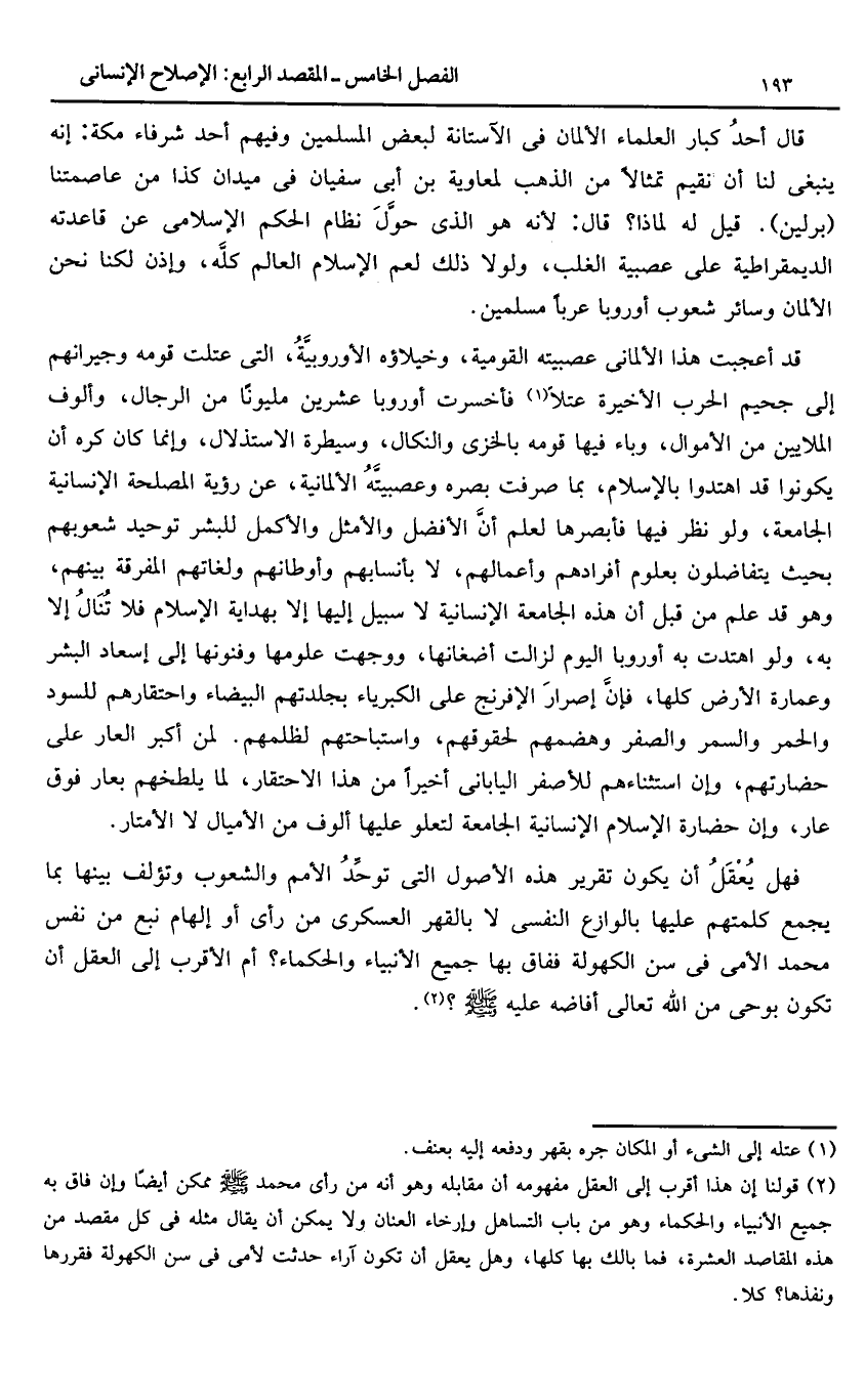 قد أعجبت هذا الألمانى عصبيته القومية، وخيلاؤه الأوروبيّة، التى عتلت قومه وجيرانهم إلى جحيم الحرب الأخيرة عتلا «1» فأخسرت أوروبا عشرين مليونا من الرجال، وألوف الملايين من الأموال، وباء فيها قومه بالخزى والنكال، وسيطرة الاستذلال، وإنما كان كره أن يكونوا قد اهتدوا بالإسلام، بما صرفت بصره وعصبيّته الألمانية، عن رؤية المصلحة الإنسانية الجامعة، ولو نظر فيها فأبصرها لعلم أنّ الأفضل والأمثل والأكمل للبشر توحيد شعوبهم بحيث يتفاضلون بعلوم أفرادهم وأعمالهم، لا بأنسابهم وأوطانهم ولغاتهم المفرقة بينهم، وهو قد علم من قبل أن هذه الجامعة الإنسانية لا سبيل إليها إلا بهداية الإسلام فلا تنال إلا به، ولو اهتدت به أوروبا اليوم لزالت أضغانها، ووجهت علومها وفنونها إلى إسعاد البشر وعمارة الأرض كلها، فإنّ إصرار الإفرنج على الكبرياء بجلدتهم البيضاء واحتقارهم للسود والحمر والسمر والصفر وهضمهم لحقوقهم، واستباحتهم لظلمهم. لمن أكبر العار على حضارتهم، وإن استثناءهم للأصفر اليابانى أخيرا من هذا الاحتقار، لما يلطخهم بعار فوق عار، وإن حضارة الإسلام الإنسانية الجامعة لتعلو عليها ألوف من الأميال لا الأمتار.