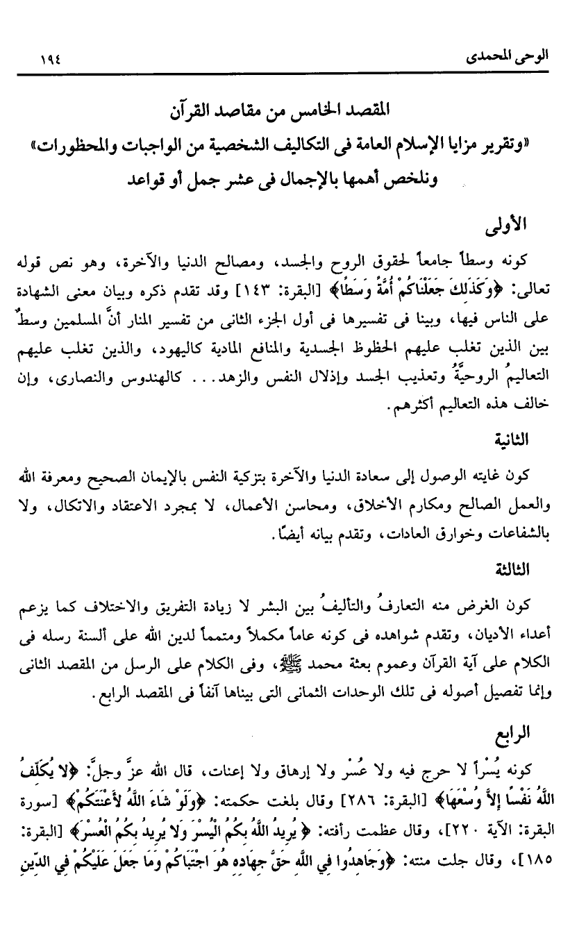 المقصد الخامس من مقاصد القرآن «وتقرير مزايا الإسلام العامة فى التكاليف الشخصية من الواجبات والمحظورات» ونلخص أهمها بالإجمال فى عشر جمل أو قواعد