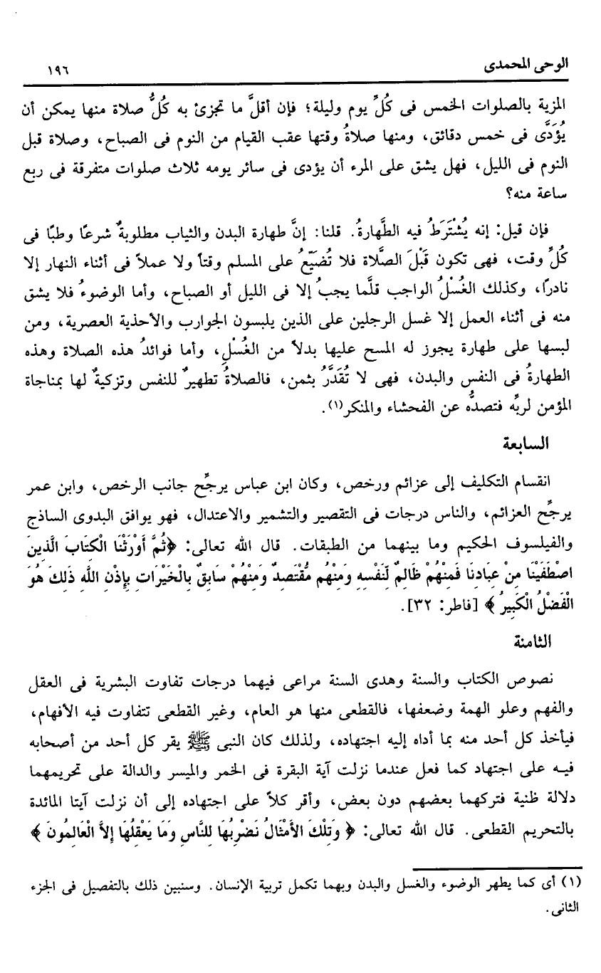 فإن قيل: إنه يشترط فيه الطّهارة. قلنا: إنّ طهارة البدن والثياب مطلوبة شرعا وطبا فى كلّ وقت، فهى تكون قبل الصّلاة فلا تضيّع على المسلم وقتا ولا عملا فى أثناء النهار إلا نادرا، وكذلك الغسل الواجب قلّما يجب إلا فى الليل أو الصباح، وأما الوضوء فلا يشق منه فى أثناء العمل إلا غسل الرجلين على الذين يلبسون الجوارب والأحذية العصرية، ومن لبسها على طهارة يجوز له المسح عليها بدلا من الغسل، وأما فوائد هذه الصلاة وهذه الطهارة فى النفس والبدن، فهى لا تقدّر بثمن، فالصلاة تطهير للنفس وتزكية لها بمناجاة المؤمن لربّه فتصدّه عن الفحشاء والمنكر «1».