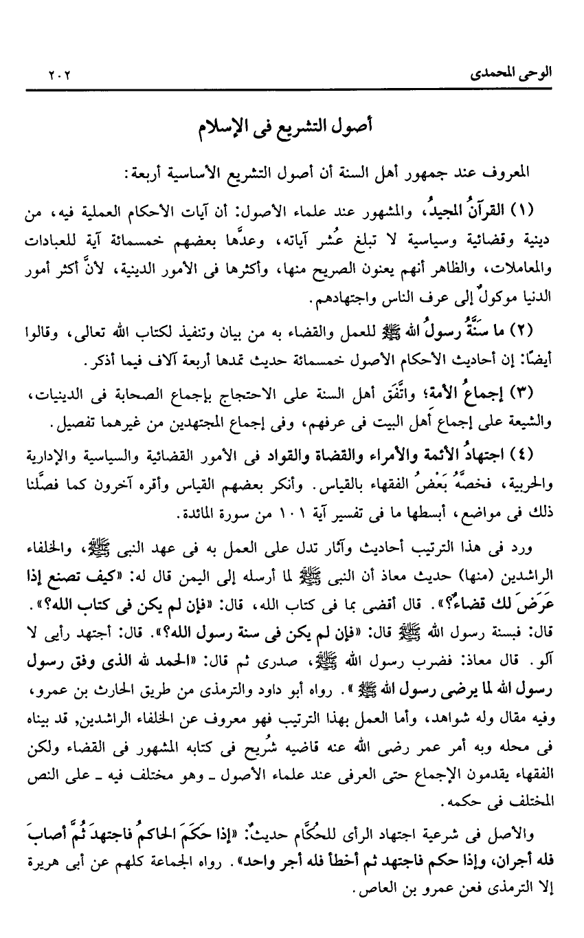 قال: فبسنّة رسول الله صلّى الله عليه وسلّم قال: «فإن لم يكن فى سنة رسول الله؟». قال: أجتهد رأيى لا آلو. قال معاذ: فضرب رسول الله صلّى الله عليه وسلّم، صدرى ثم قال: «الحمد لله الذى وفق رسول رسول الله لما يرضى رسول الله صلّى الله عليه وسلّم». رواه أبو داود والترمذى من طريق الحارث بن عمرو، وفيه مقال وله شواهد، وأما العمل بهذا الترتيب فهو معروف عن الخلفاء الراشدين، قد بيناه فى محله وبه أمر عمر رضى الله عنه قاضيه شريح فى كتابه المشهور فى القضاء ولكن الفقهاء يقدمون الإجماع حتى العرفى عند علماء الأصول- وهو مختلف فيه- على النص المختلف فى حكمه.