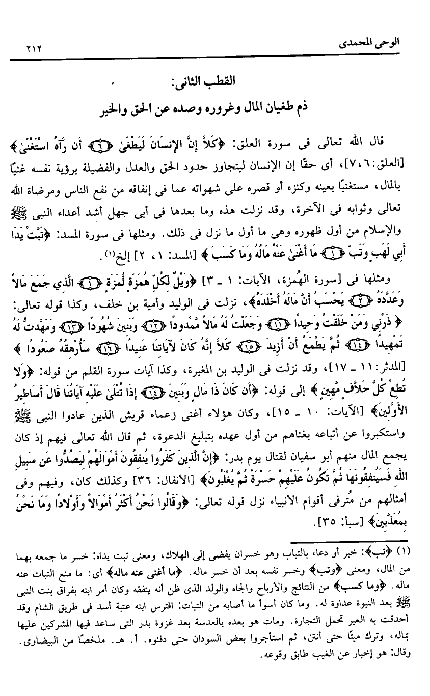 قال الله تعالى فى سورة العلق: كَلَّا إِنَّ الْإِنْسانَ لَيَطْغى (6) أَنْ رَآهُ اسْتَغْنى [العلق: 6، 7]، أى حقّا إن الإنسان ليتجاوز حدود الحق والعدل والفضيلة برؤية نفسه غنيا بالمال، مستغنيا بعينه وكنزه أو قصره على شهواته عما فى إنفاقه من نفع الناس ومرضاة الله تعالى وثوابه فى الآخرة، وقد نزلت هذه وما بعدها فى أبى جهل أشد أعداء النبى صلّى الله عليه وسلّم والإسلام من أول ظهوره وهى ما أول ما نزل فى ذلك. ومثلها فى سورة المسد: تَبَّتْ يَدا أَبِي لَهَبٍ وَتَبَّ (1) ما أَغْنى عَنْهُ مالُهُ وَما كَسَبَ [المسد: 1، 2] إلخ «1».