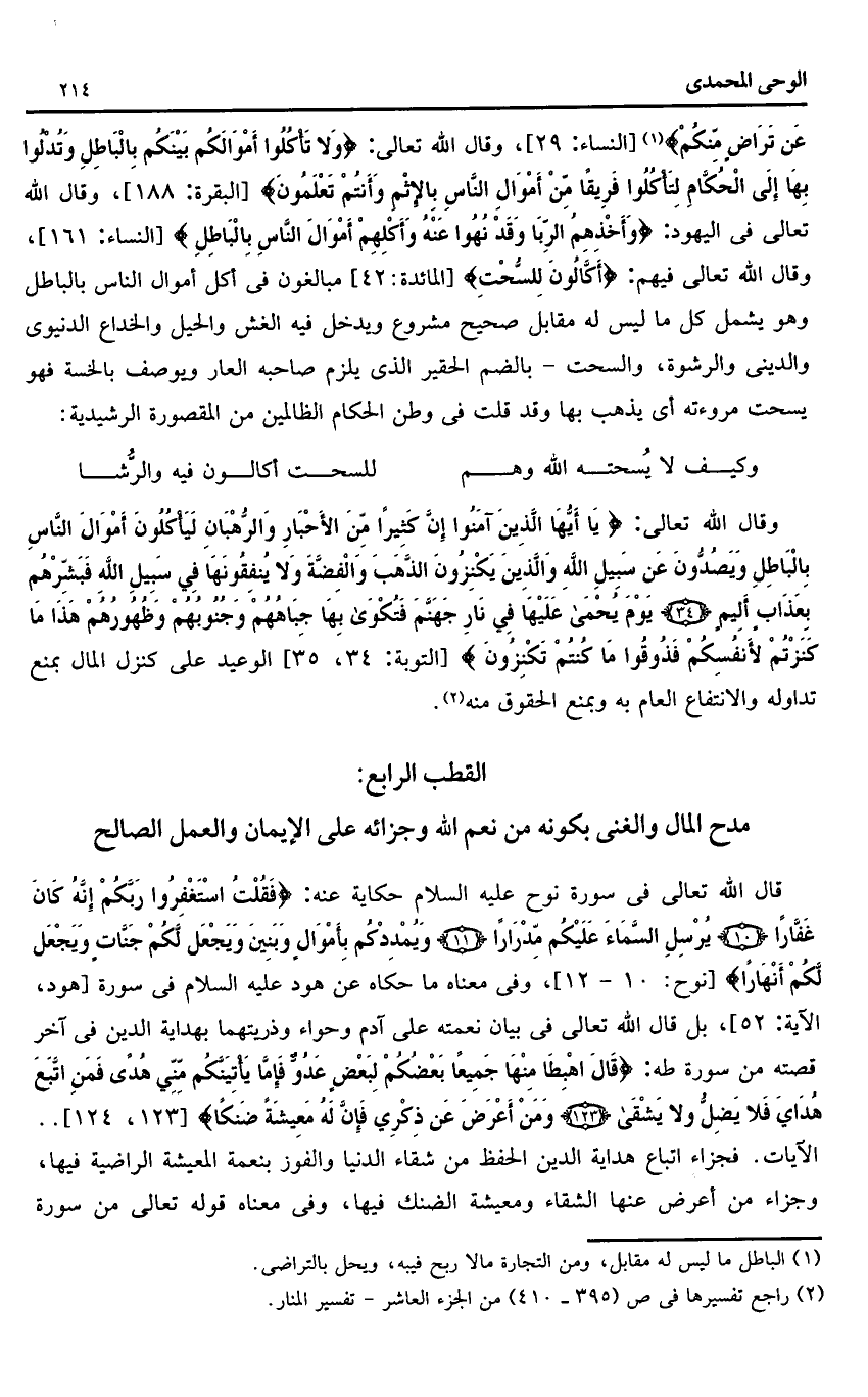 عَنْ تَراضٍ مِنْكُمْ «1» [النساء: 29]، وقال الله تعالى: وَلا تَأْكُلُوا أَمْوالَكُمْ بَيْنَكُمْ بِالْباطِلِ وَتُدْلُوا بِها إِلَى الْحُكَّامِ لِتَأْكُلُوا فَرِيقاً مِنْ أَمْوالِ النَّاسِ بِالْإِثْمِ وَأَنْتُمْ تَعْلَمُونَ [البقرة: 188]، وقال الله تعالى فى اليهود: وَأَخْذِهِمُ الرِّبَوا وَقَدْ نُهُوا عَنْهُ وَأَكْلِهِمْ أَمْوالَ النَّاسِ بِالْباطِلِ [النساء: 161]، وقال الله تعالى فيهم: أَكَّالُونَ لِلسُّحْتِ [المائدة: 42] مبالغون فى أكل أموال الناس بالباطل وهو يشمل كل ما ليس له مقابل صحيح مشروع ويدخل فيه الغش والحيل والخداع الدنيوى والدينى والرشوة، والسحت- بالضم الحقير الذى يلزم صاحبه العار ويوصف بالخسة فهو يسحت مروءته أى يذهب بها وقد قلت فى وطن الحكام الظالمين من المقصورة الرشيدية: