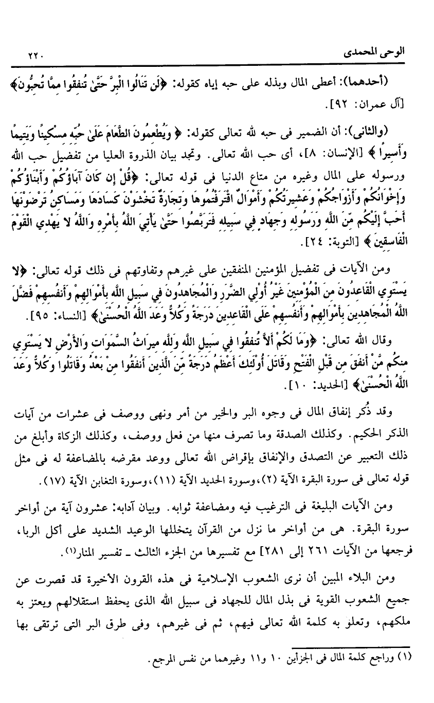 ومن البلاء المبين أن نرى الشعوب الإسلامية فى هذه القرون الأخيرة قد قصرت عن جميع الشعوب القوية فى بذل المال للجهاد فى سبيل الله الذى يحفظ استقلالهم ويعتز به ملكهم، وتعلو به كلمة الله تعالى فيهم، ثم فى غيرهم، وفى طرق البر التى ترتقى بها