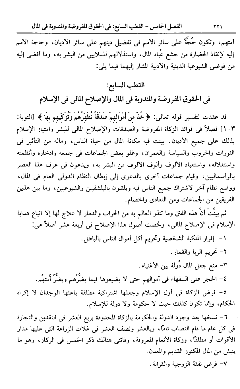 القطب السابع: فى الحقوق المفروضة والمندوبة فى المال والإصلاح المالى فى الإسلام
