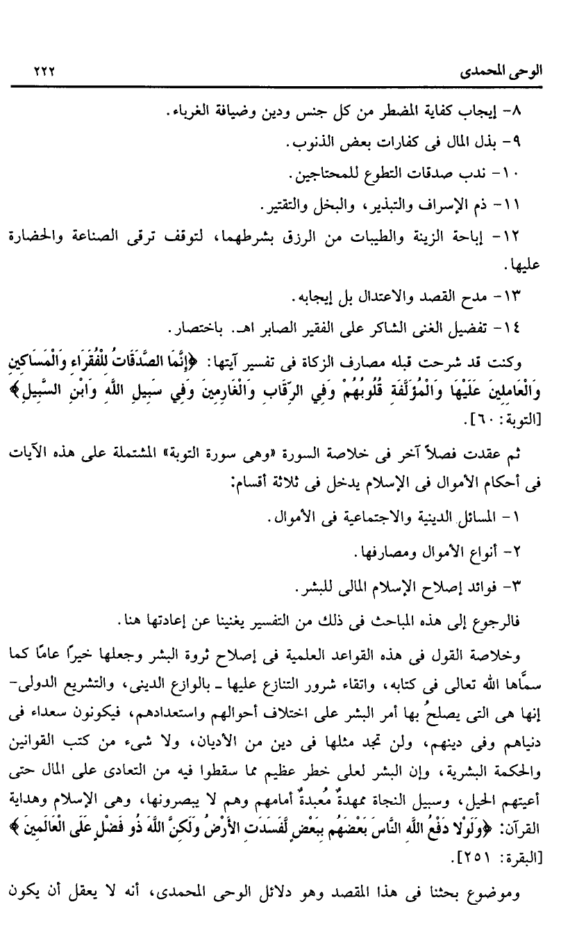 ثم عقدت فصلا آخر فى خلاصة السورة «وهى سورة التوبة» المشتملة على هذه الآيات فى أحكام الأموال فى الإسلام يدخل فى ثلاثة أقسام:
