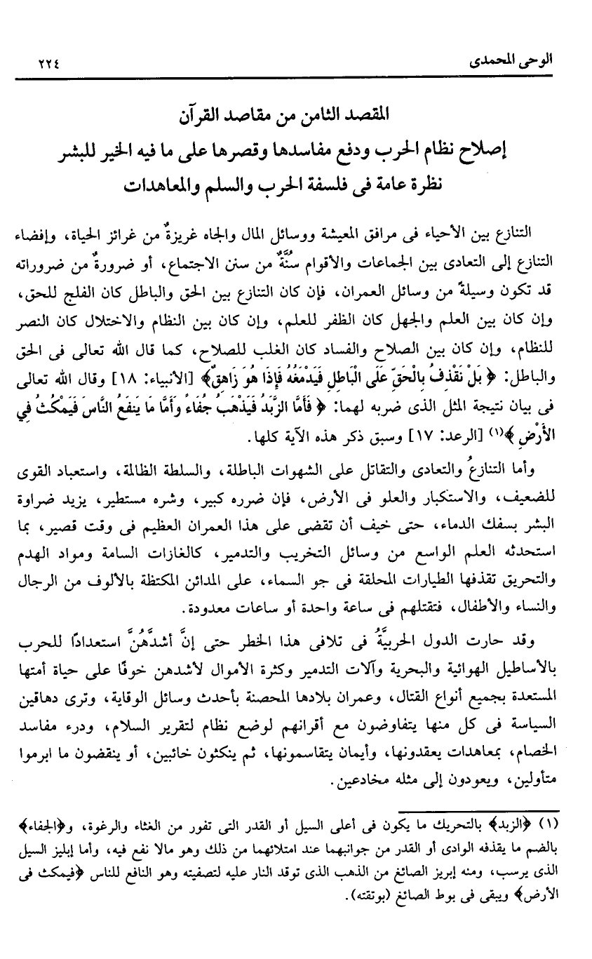 المقصد الثامن من مقاصد القرآن إصلاح نظام الحرب ودفع مفاسدها وقصرها على ما فيه الخير للبشر نظرة عامة فى فلسفة الحرب والسلم والمعاهدات