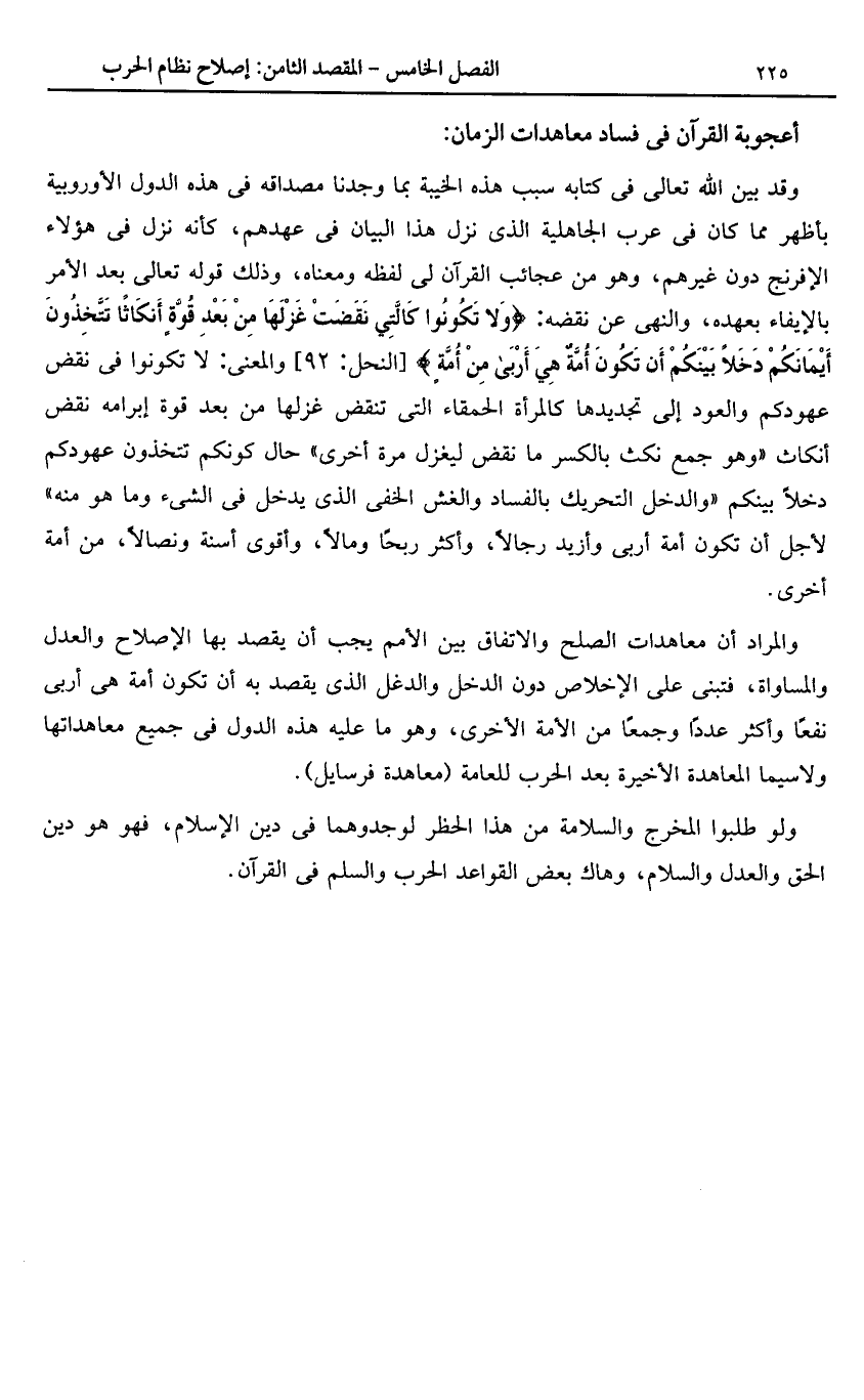 والمراد أن معاهدات الصلح والاتفاق بين الأمم يجب أن يقصد بها الإصلاح والعدل والمساواة، فتبنى على الإخلاص دون الدخل والدغل الذى يقصد به أن تكون أمة هى أربى نفعا وأكثر عددا وجمعا من الأمة الأخرى، وهو ما عليه هذه الدول فى جميع معاهداتها ولا سيما المعاهدة الأخيرة بعد الحرب للعامة (معاهدة فرسايل).