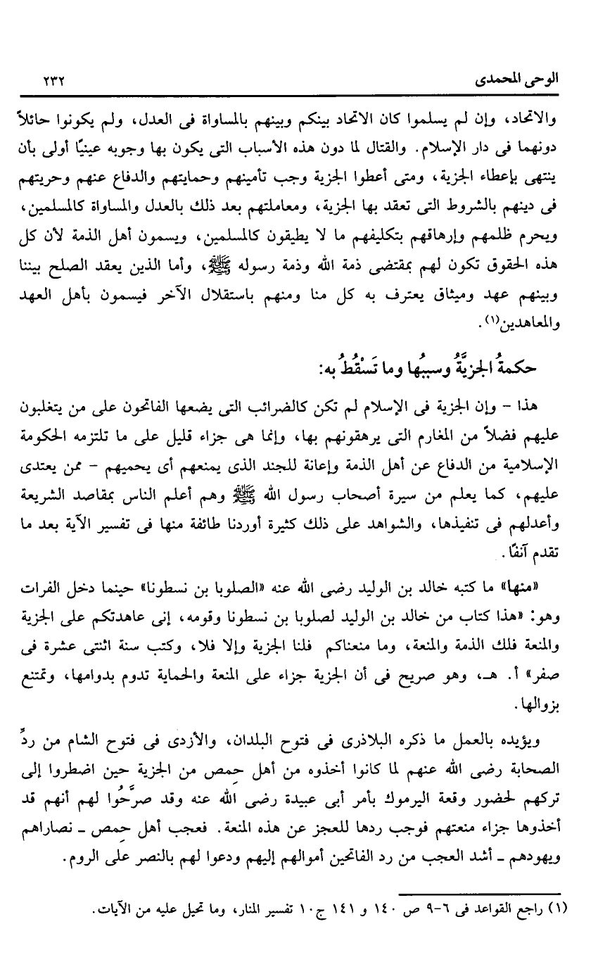 هذا- وإن الجزية فى الإسلام لم تكن كالضرائب التى يضعها الفاتحون على من يتغلبون عليهم فضلا من المغارم التى يرهقونهم بها، وإنما هى جزاء قليل على ما تلتزمه الحكومة الإسلامية من الدفاع عن أهل الذمة وإعانة للجند الذى يمنعهم أى يحميهم- ممن يعتدى عليهم، كما يعلم من سيرة أصحاب رسول الله صلّى الله عليه وسلّم وهم أعلم الناس بمقاصد الشريعة وأعدلهم فى تنفيذها، والشواهد على ذلك كثيرة أوردنا طائفة منها فى تفسير الآية بعد ما تقدم آنفا.
