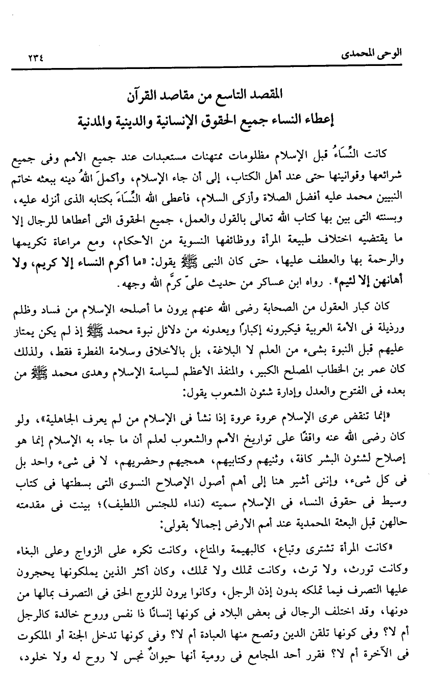 المقصد التاسع من مقاصد القرآن إعطاء النساء جميع الحقوق الإنسانية والدينية والمدنية