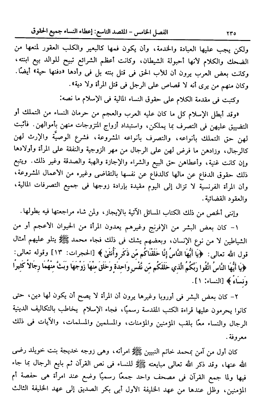 «وقد أبطل الإسلام كل ما كان عليه العرب والعجم من حرمان النساء من التملك أو التضييق عليهن فى التصرف بما يملكن، واستبداد أزواج المتزوجات منهن بأموالهن. فأثبت لهن حق التملك بأنواعه، والتصرف بأنواعه المشروعة، فشرع الوصيّة والإرث لهن كالرجال، وزادهن ما فرض لهن على الرجال من مهر الزوجية والنفقة على المرأة وأولادها وإن كانت غنية، وأعطاهن حق البيع والشراء والإجازة والهبة والصدقة وغير ذلك. ويتبع ذلك حقوق الدفاع عن مالها كالدفاع عن نفسها بالتقاضى وغيره من الأعمال المشروعة، وأن المرأة الفرنسية لا تزال إلى اليوم مقيدة بإرادة زوجها فى جميع التصرفات المالية، والعقود القضائية.