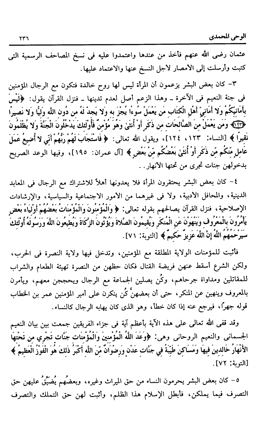 4 - كان بعض البشر يحتقرون المرأة فلا يعدونها أهلا للاشتراك مع الرجال فى المعابد الدينية، والمحافل الأدبية، ولا فى غيرهما من الأمور الاجتماعية والسياسية، والإرشادات الإصلاحية، فنزل القرآن يصالحهم بقوله تعالى: وَالْمُؤْمِنُونَ وَالْمُؤْمِناتُ بَعْضُهُمْ أَوْلِياءُ بَعْضٍ يَأْمُرُونَ بِالْمَعْرُوفِ وَيَنْهَوْنَ عَنِ الْمُنْكَرِ وَيُقِيمُونَ الصَّلاةَ وَيُؤْتُونَ الزَّكاةَ وَيُطِيعُونَ اللَّهَ وَرَسُولَهُ أُولئِكَ سَيَرْحَمُهُمُ اللَّهُ إِنَّ اللَّهَ عَزِيزٌ حَكِيمٌ [التوبة: 71].