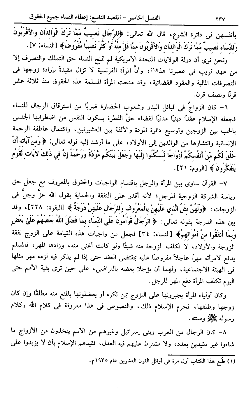 ونحن نرى أن دولة الولايات المتحدة الأمريكية لم تمنح النساء حق التملك والتصرف إلا من عهد قريب فى عصرنا هذا «1»، وأنّ المرأة الفرنسية لا تزال مقيدة بإرادة زوجها فى التصرفات المالية والعقود القضائية، وقد منحت المرأة المسلمة هذه الحقوق منذ ثلاثة عشر قرنا ونصف قرن.