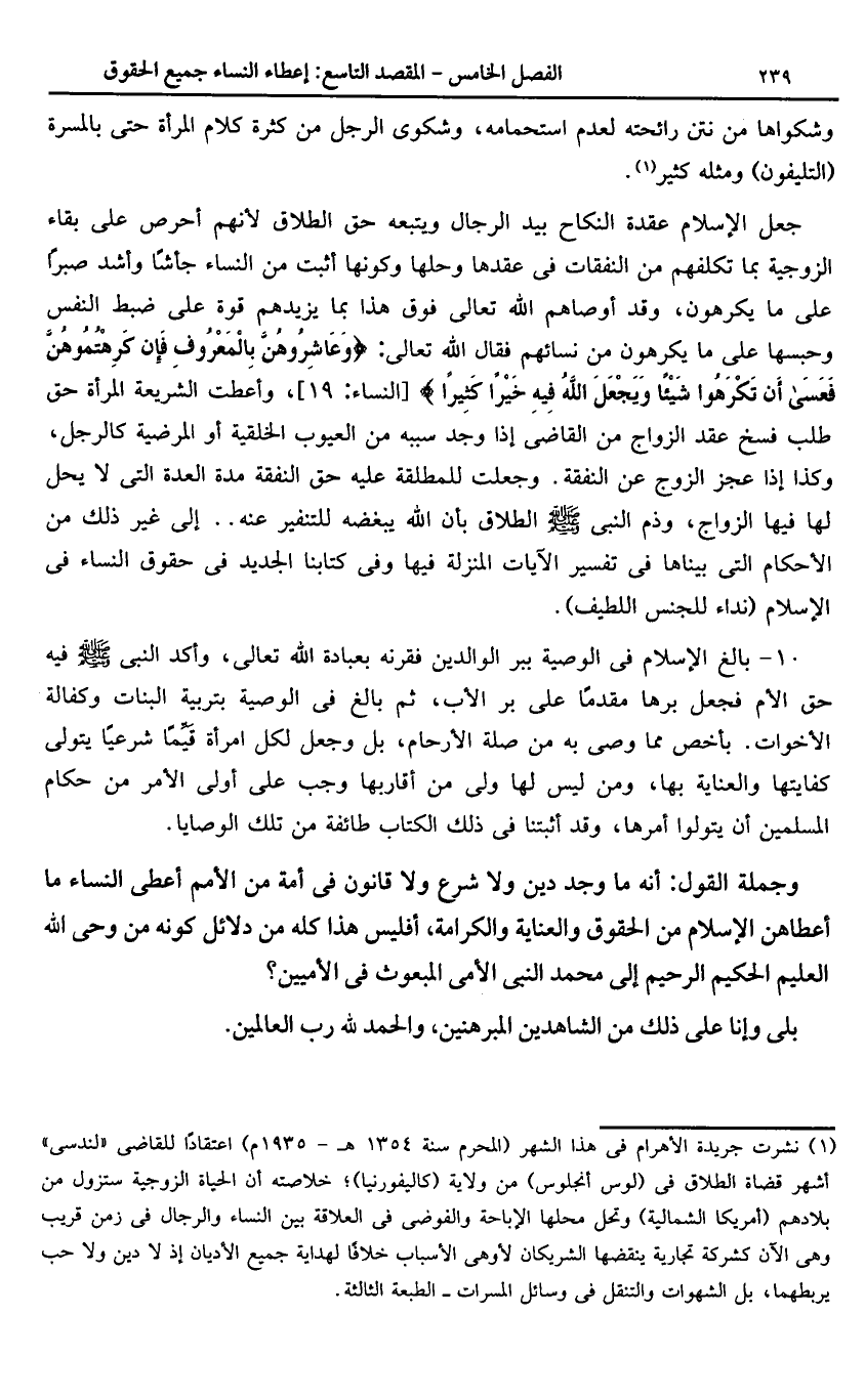 (1) نشرت جريدة الأهرام فى هذا الشهر (المحرم سنة 1354 هـ- 1935 م) اعتقادا للقاضى «لندسى» أشهر قضاة الطلاق فى (لوس أنجلوس) من ولاية (كاليفورنيا)؛ خلاصته أن الحياة الزوجية ستزول من بلادهم (أمريكا الشمالية) وتحل محلها الإباحة والفوضى فى العلاقة بين النساء والرجال فى زمن قريب وهى الآن كشركة تجارية ينقضها الشريكان لأوهى الأسباب خلافا لهداية جميع الأديان إذ لا دين ولا حب يربطهما، بل الشهوات والتنقل فى وسائل المسرات- الطبعة الثالثة.