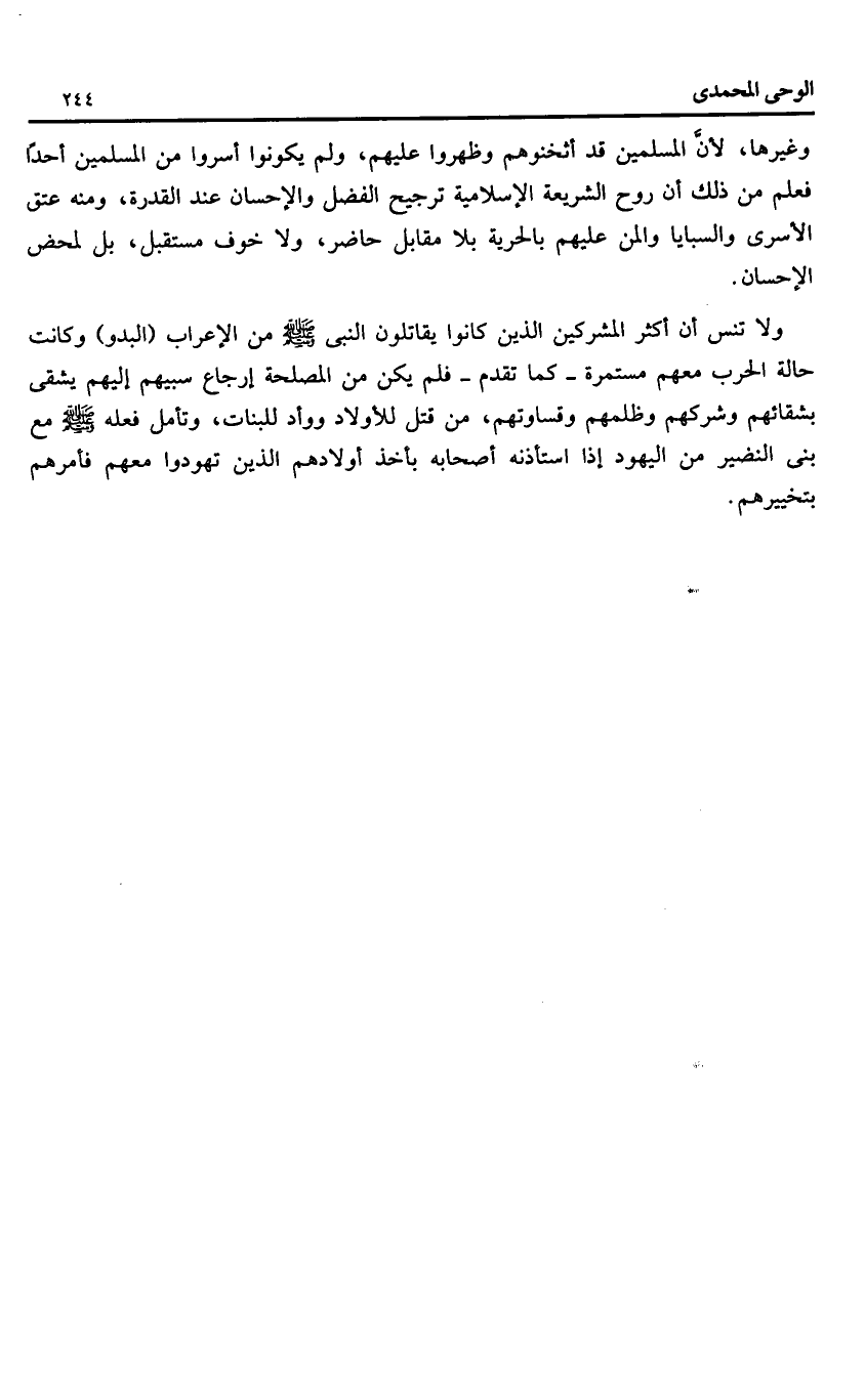 ولا تنس أن أكثر المشركين الذين كانوا يقاتلون النبى صلّى الله عليه وسلّم من الإعراب (البدو) وكانت حالة الحرب معهم مستمرة- كما تقدم- فلم يكن من المصلحة إرجاع سبيهم إليهم يشقى بشقائهم وشركهم وظلمهم وقساوتهم، من قتل للأولاد ووأد للبنات، وتأمل فعله صلّى الله عليه وسلّم مع بنى النضير من اليهود إذا استأذنه أصحابه بأخذ أولادهم الذين تهودوا معهم فأمرهم بتخييرهم.